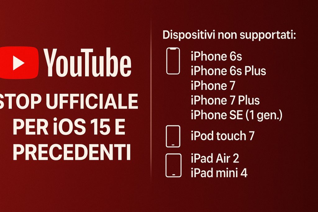 L’elenco dei prodotti esclusi dal supporto ufficiale a YouTube su iOS comprende tutti i modelli non aggiornabili a iOS 16. In dettaglio, i dispositivi interessati sono: