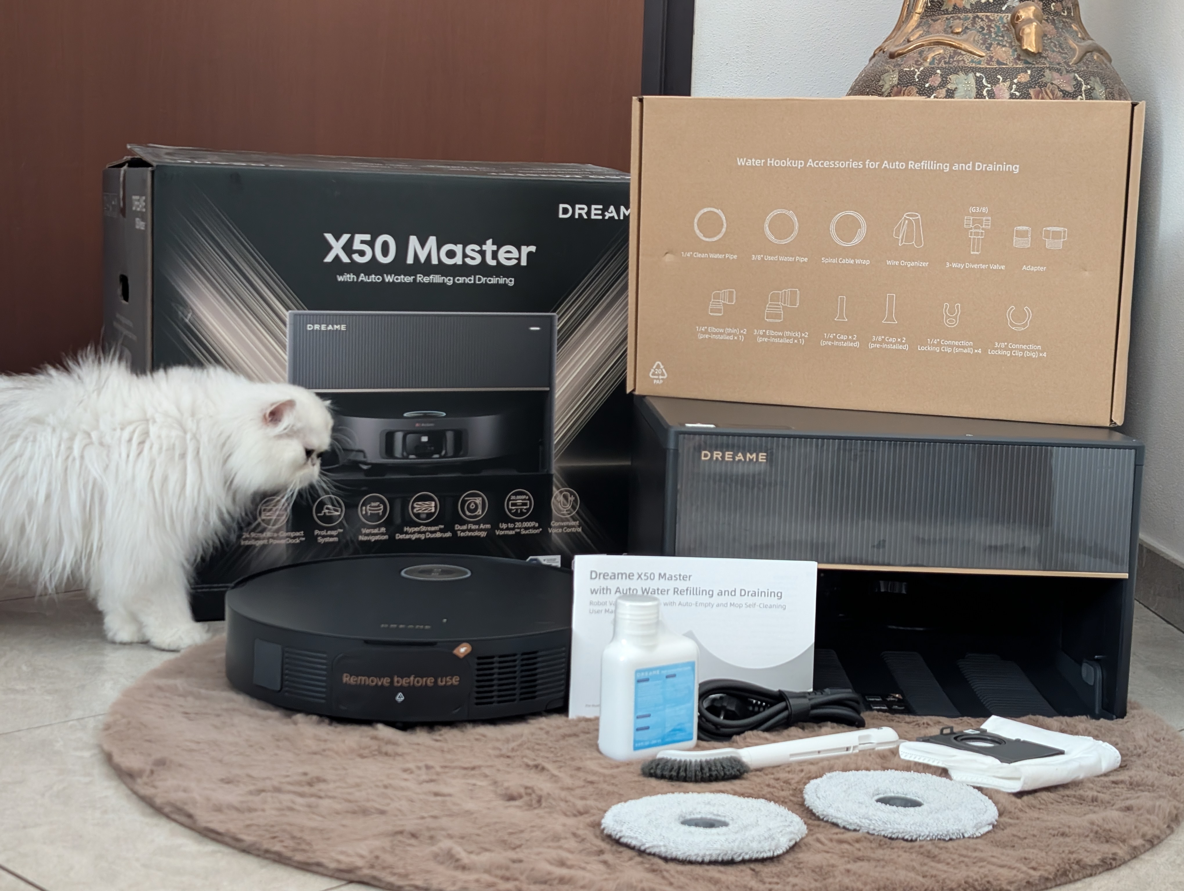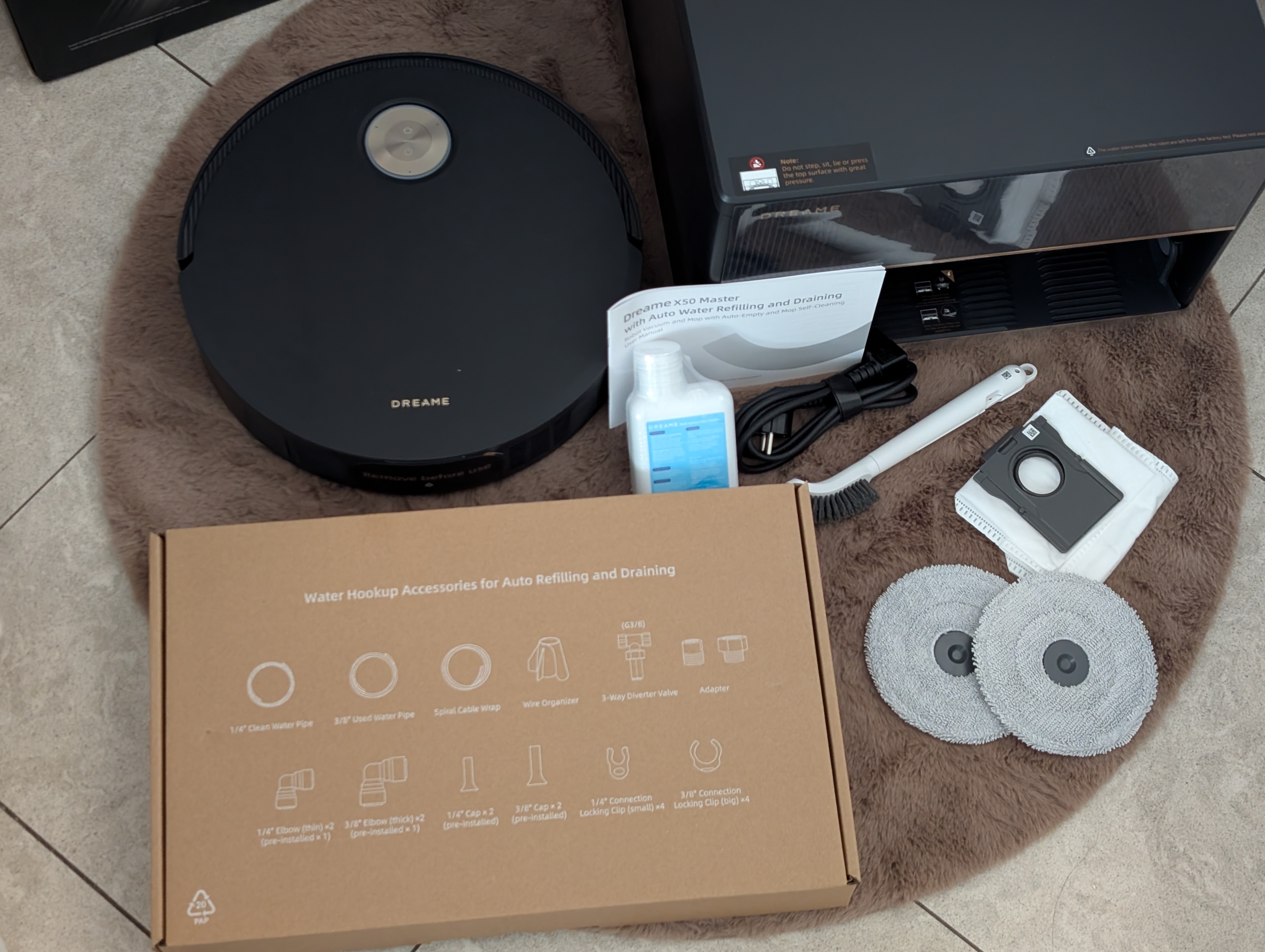 La confezione del Dreame X50 Master riflette chiaramente la natura premium del prodotto. Non ci sono sorprese negative né accessori da acquistare a parte: il robot arriva corredato di tutto il necessario per sfruttarne da subito ogni funzione, compreso il kit per l’allaccio idrico diretto, che lo distingue dalla maggior parte dei concorrenti.