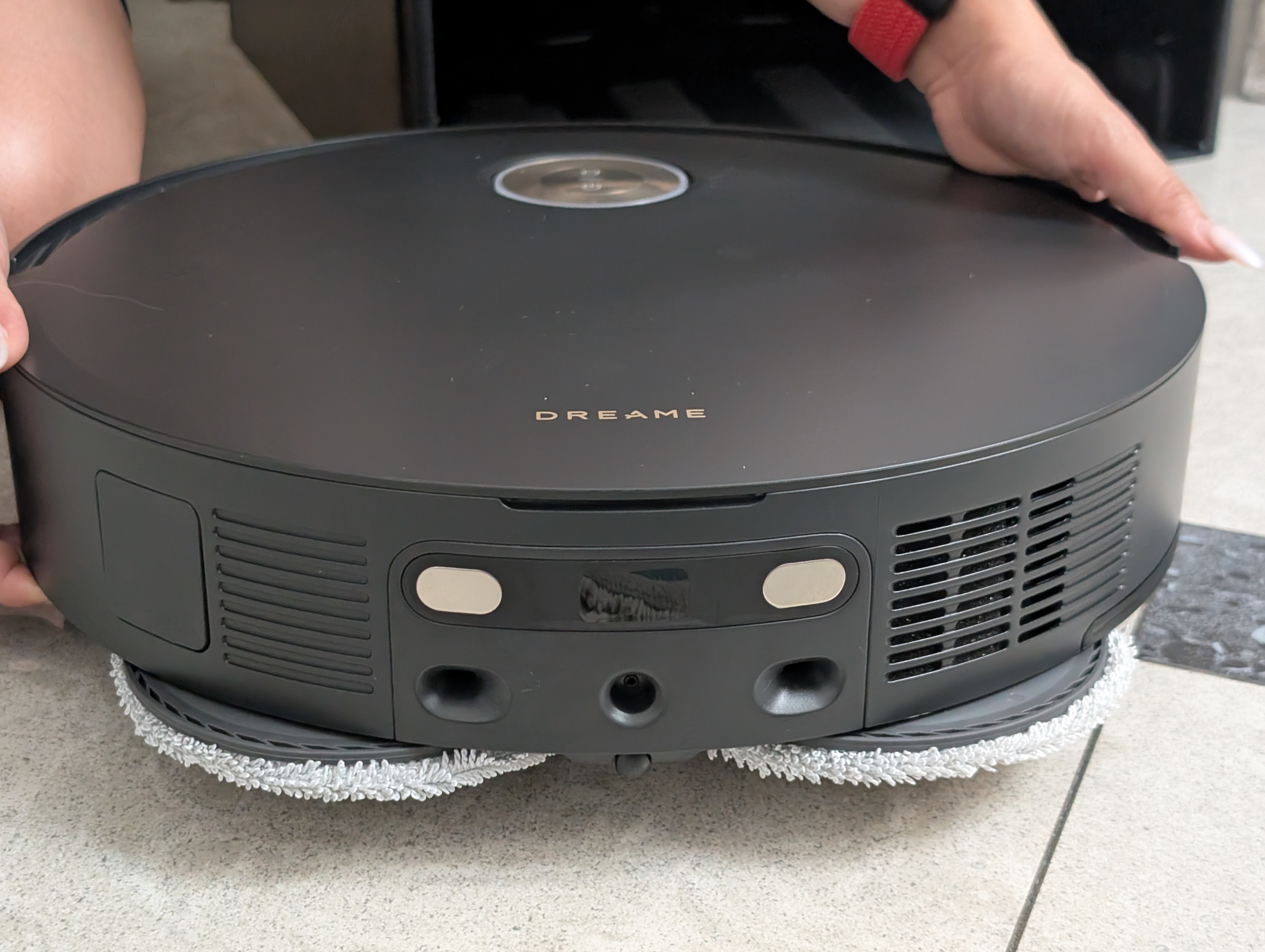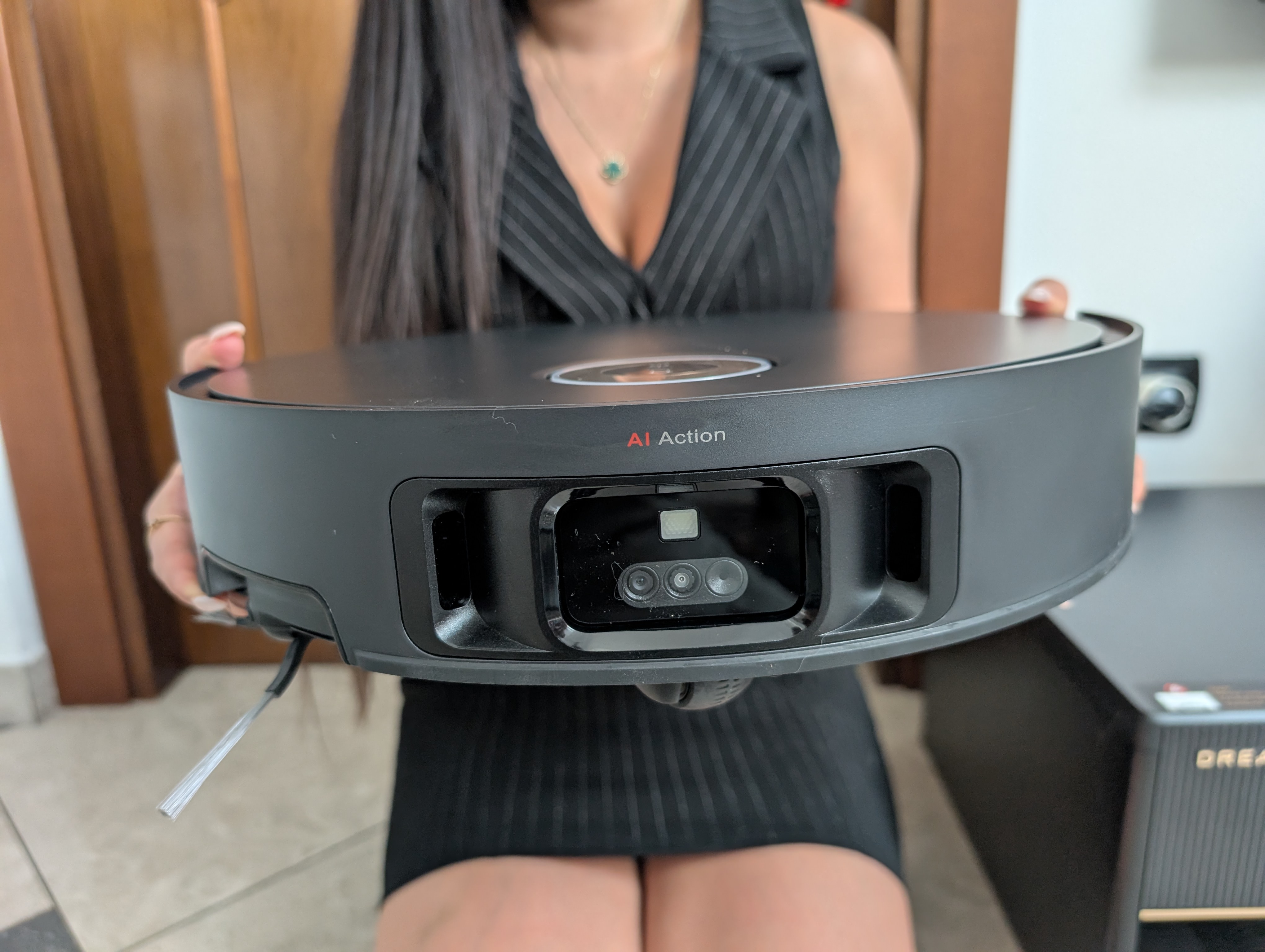 La parte frontale del robot ospita la videocamera RGB affiancata da un LED e da sensori di profondità. Il robot utilizza un algoritmo AI proprietario (Dreame AI Action) per riconoscere una vasta gamma di oggetti comuni: ciabatte, scarpe, cavi, calzini, ciotole di animali, e perfino piccoli “incidenti” come i bisognini dei pet. Anche se fortunatamente non ho testato quest’ultimo caso, posso dire che in presenza di ostacoli come giocattoli, fili sparsi o oggetti bassi, il Dreame X50 Master li rileva, rallenta e li aggira con estrema naturalezza.