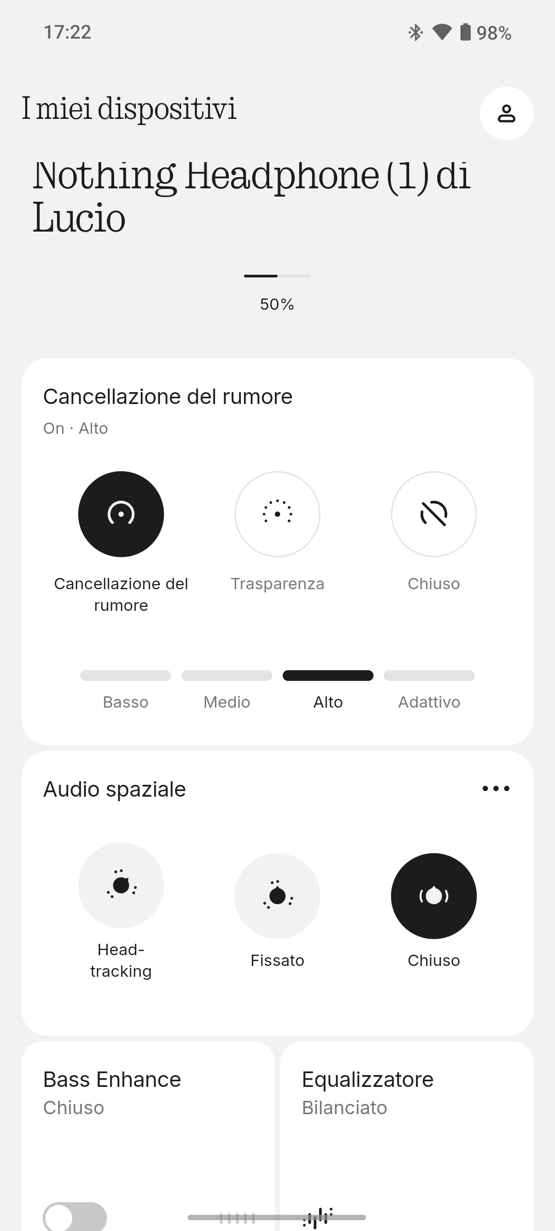 Dall’app si può regolare il comportamento dell’ANC adattiva, scegliere se lasciarla automatica oppure manuale, e passare rapidamente alla modalità trasparente. Il passaggio tra le due modalità è veloce e silenzioso, senza “click” o delay.
