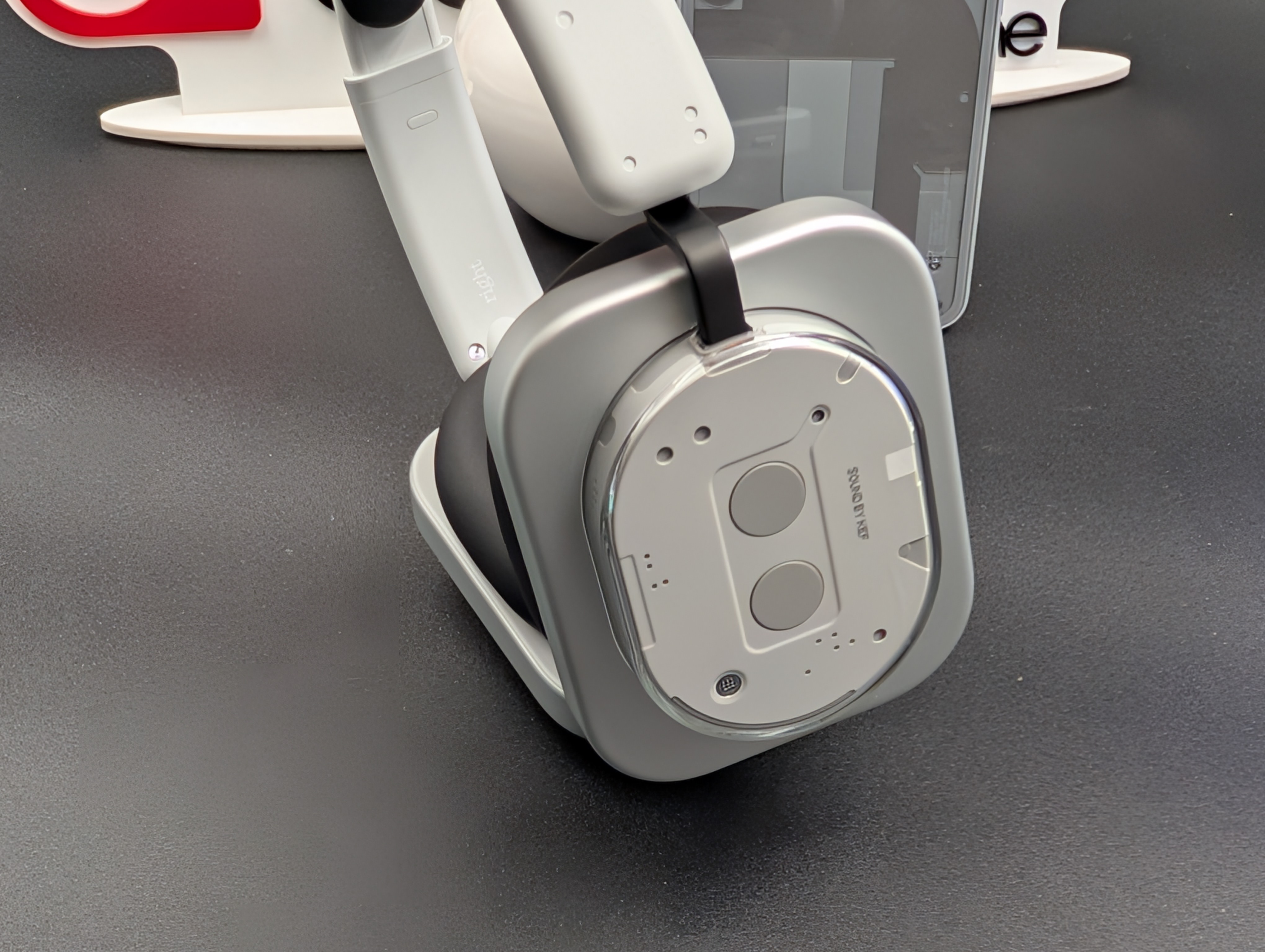I padiglioni hanno una forma squadrata con bordi stondati, un approccio fuori dagli schemi nel contesto over-ear. La parte superiore è in plastica lucida trasparente che lascia intravedere le camere acustiche e parte dell’elettronica. Quella inferiore è in alluminio spazzolato, con una finitura satinata che restituisce al tatto una sensazione di robustezza e raffinatezza. Il contrasto tra i due materiali è volutamente accentuato e dona carattere al prodotto.