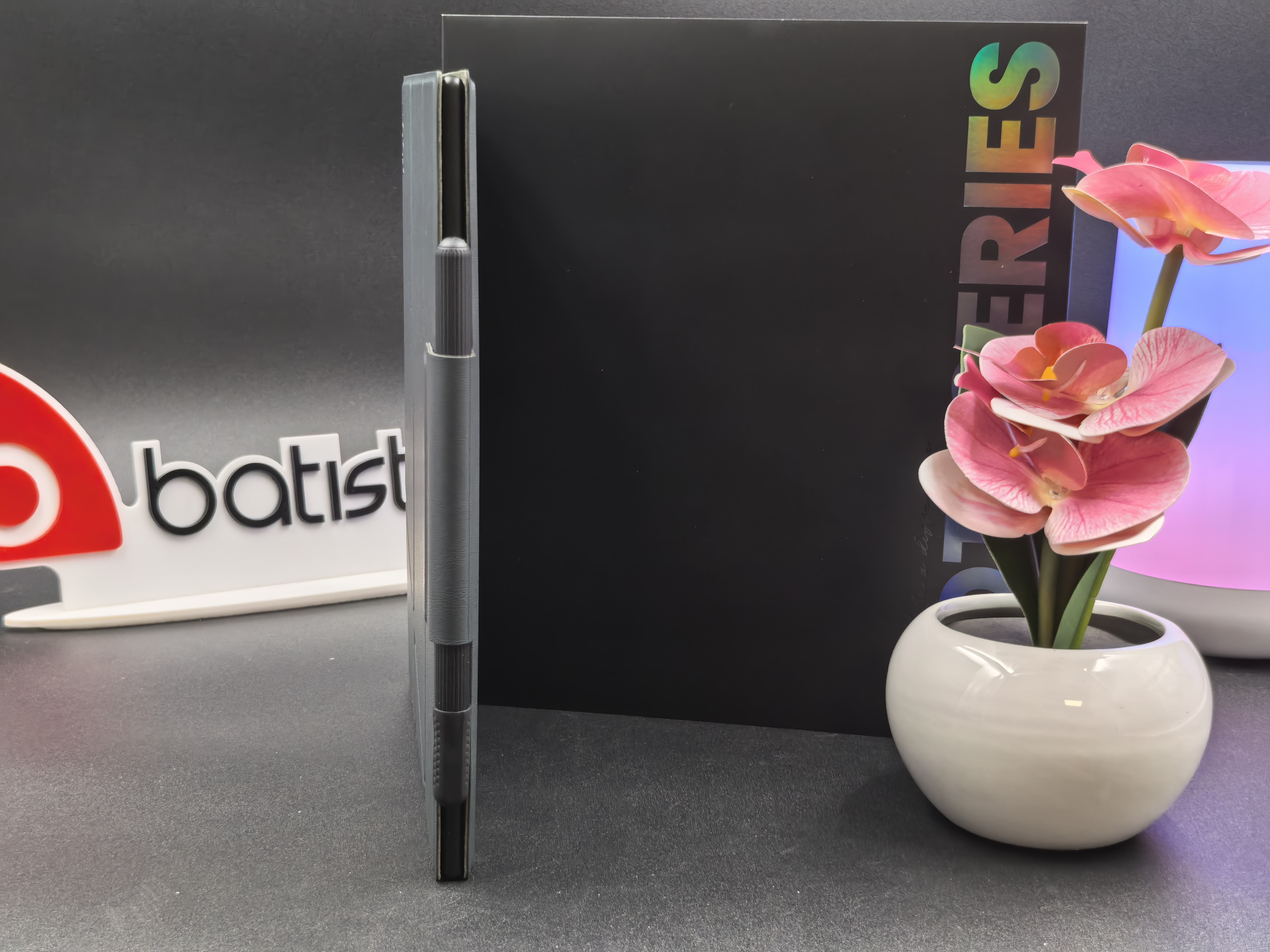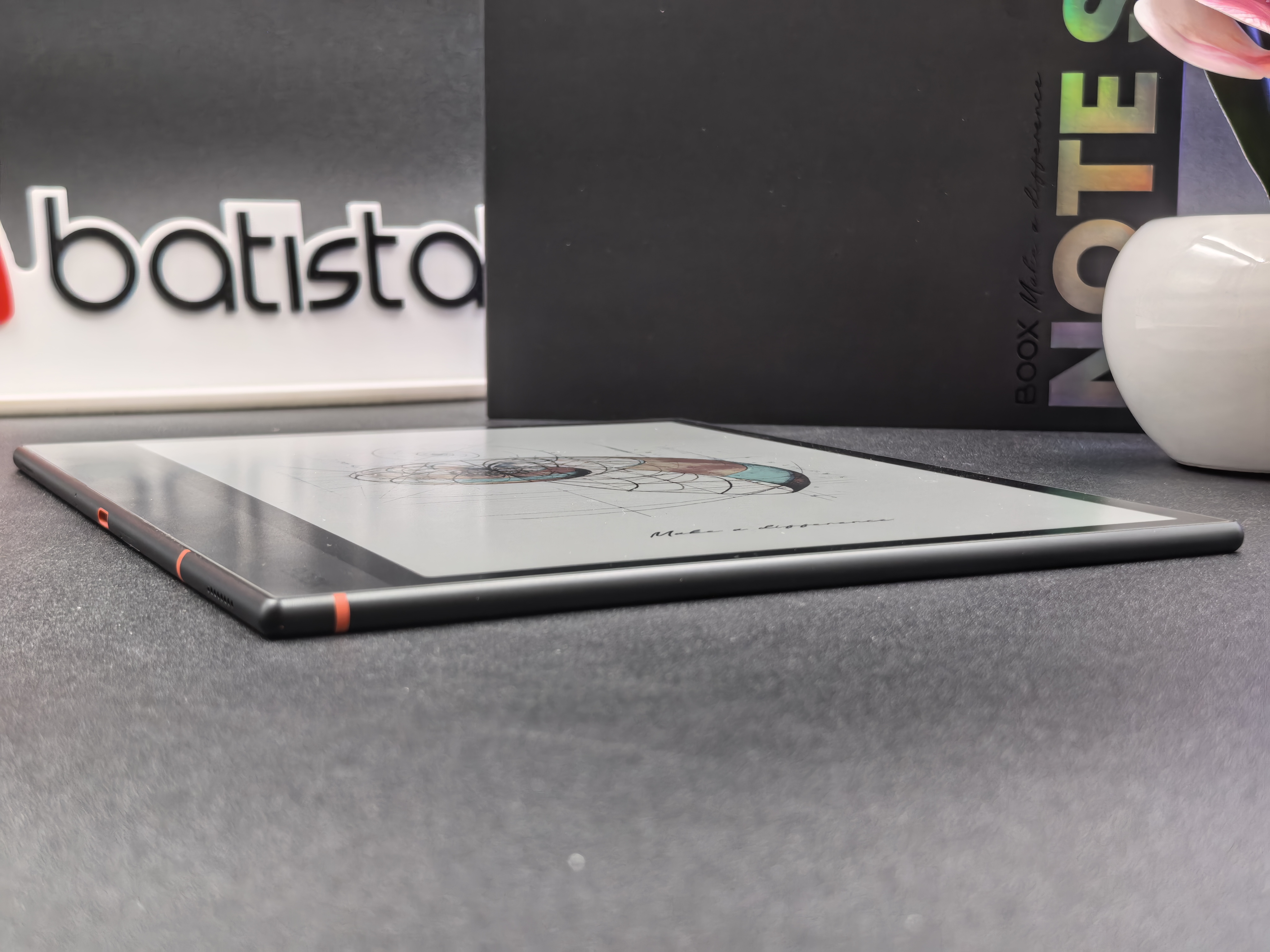 Le dimensioni sono perfette per il formato A5: 226 × 193 × 5,8 mm di spessore, per circa 420 grammi. Non è il più leggero della categoria, ma il peso è distribuito in modo ottimale, e anche durante lunghe sessioni di scrittura o lettura non affatica. Gli angoli arrotondati aiutano ulteriormente la presa, rendendolo comodo da tenere in mano anche per un’ora intera.