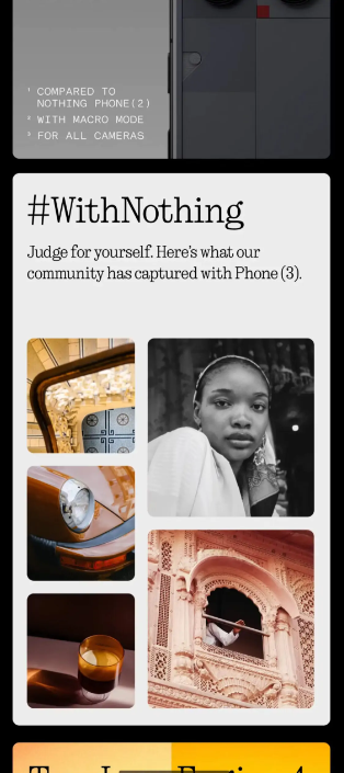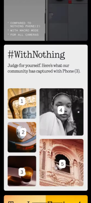 Secondo una segnalazione anonima, all’interno dell’app demo del Nothing Phone (3) sarebbe comparsa una sezione chiamata #WithNothing, accompagnata dal messaggio: “Judge for yourself. Here’s what our community has captured with the Phone (3).”