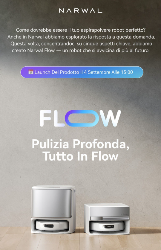 Attraverso i suoi canali social ufficiali, Narwal ha anticipato l’arrivo del suo nuovo robot di punta: il Narwal Flow, pronto a debuttare il 4 settembre durante IFA 2025.