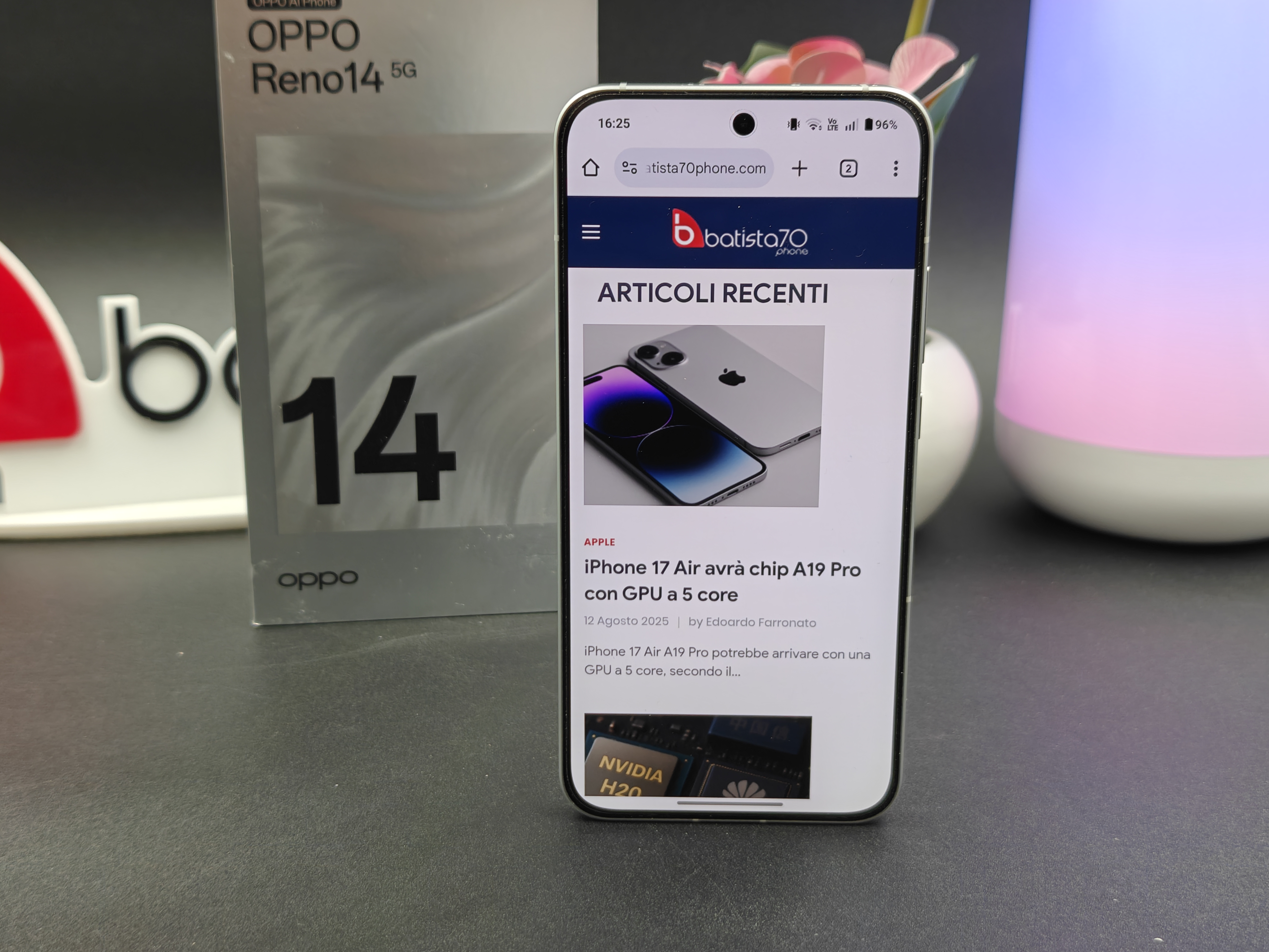 Nel quotidiano, lo schermo del Reno14 si dimostra versatile: convincente per la visione di contenuti multimediali, reattivo nelle sessioni social e comodo anche per la lettura grazie alle modalità dedicate. La superficie piatta, oltre a favorire la precisione nei tocchi, si integra alla perfezione con la scocca, rendendo il design complessivamente più pulito e moderno.