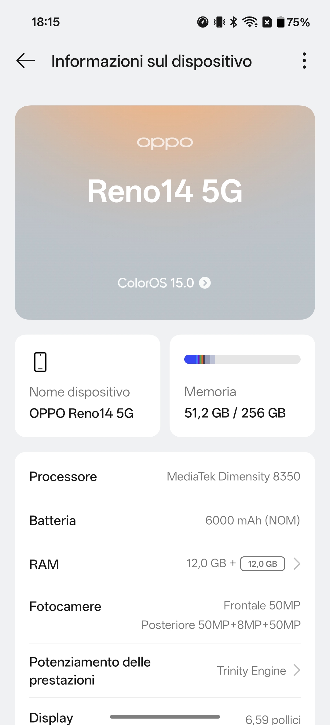 Il cuore visivo del Reno14 è un pannello AMOLED flat da 6,59 pollici con risoluzione 1.5K (circa 1256 × 2760 pixel) e refresh rate a 120 Hz, capace di garantire un’ottima fluidità sia nello scorrimento delle pagine che nelle animazioni di sistema. Il touch sampling rate raggiunge i 240 Hz, un plus apprezzabile nei giochi e nelle interazioni rapide.
