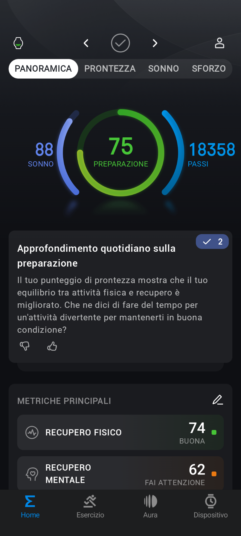 Non cambia l’interfaccia grafica, molto intuitiva e personalizzabile per visualizzare le informazioni desiderate in modi rapido: che si tratti dei dettagli sul sonno dell’ultima notte o di una sessione di allenamento, con pochi tocchi è possibile raggiungere qualsiasi dato.