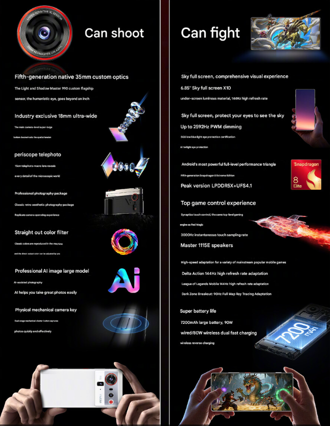 Tutto il sistema è supportato da algoritmi di intelligenza artificiale per la correzione automatica della scena e la gestione dinamica dell’esposizione. Per gli utenti più esigenti, nubia offrirà un kit fotografico dedicato, che trasformerà il telefono in una vera e propria fotocamera portatile con impugnatura ergonomica e controlli fisici.