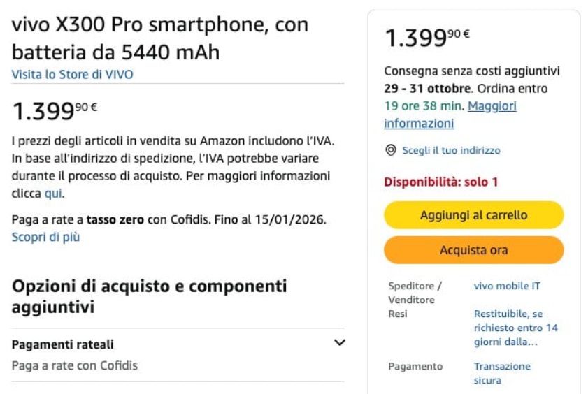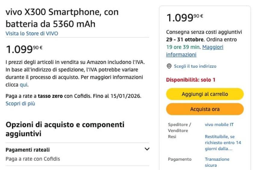 Entrambi risultano venduti e spediti da “vivo mobile IT”, la filiale italiana della compagnia, e non da rivenditori terzi. Ciò conferma che si tratta di prezzi ufficiali per il nostro mercato, al netto delle eventuali promozioni di lancio che potrebbero essere annunciate durante l’evento del 30 ottobre.
