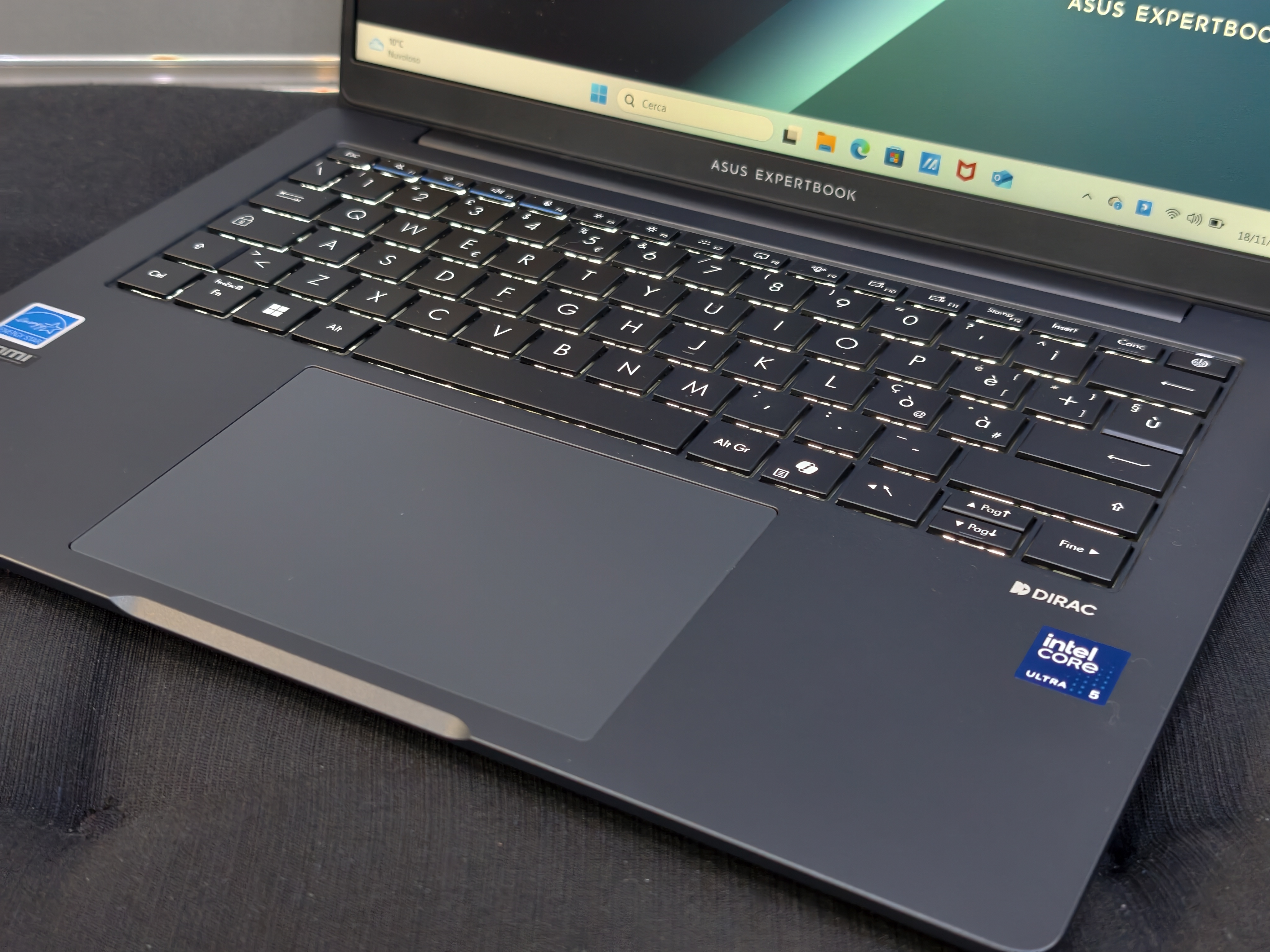 La tastiera dell’ASUS ExpertBook B3 è esattamente come dovrebbe essere su un portatile da lavoro: niente effetti speciali, ma tanta sostanza. I tasti hanno una corsa comoda, il feedback è deciso il giusto e la rumorosità resta contenuta, anche quando scrivi alla velocità di “mail del lunedì mattina”.