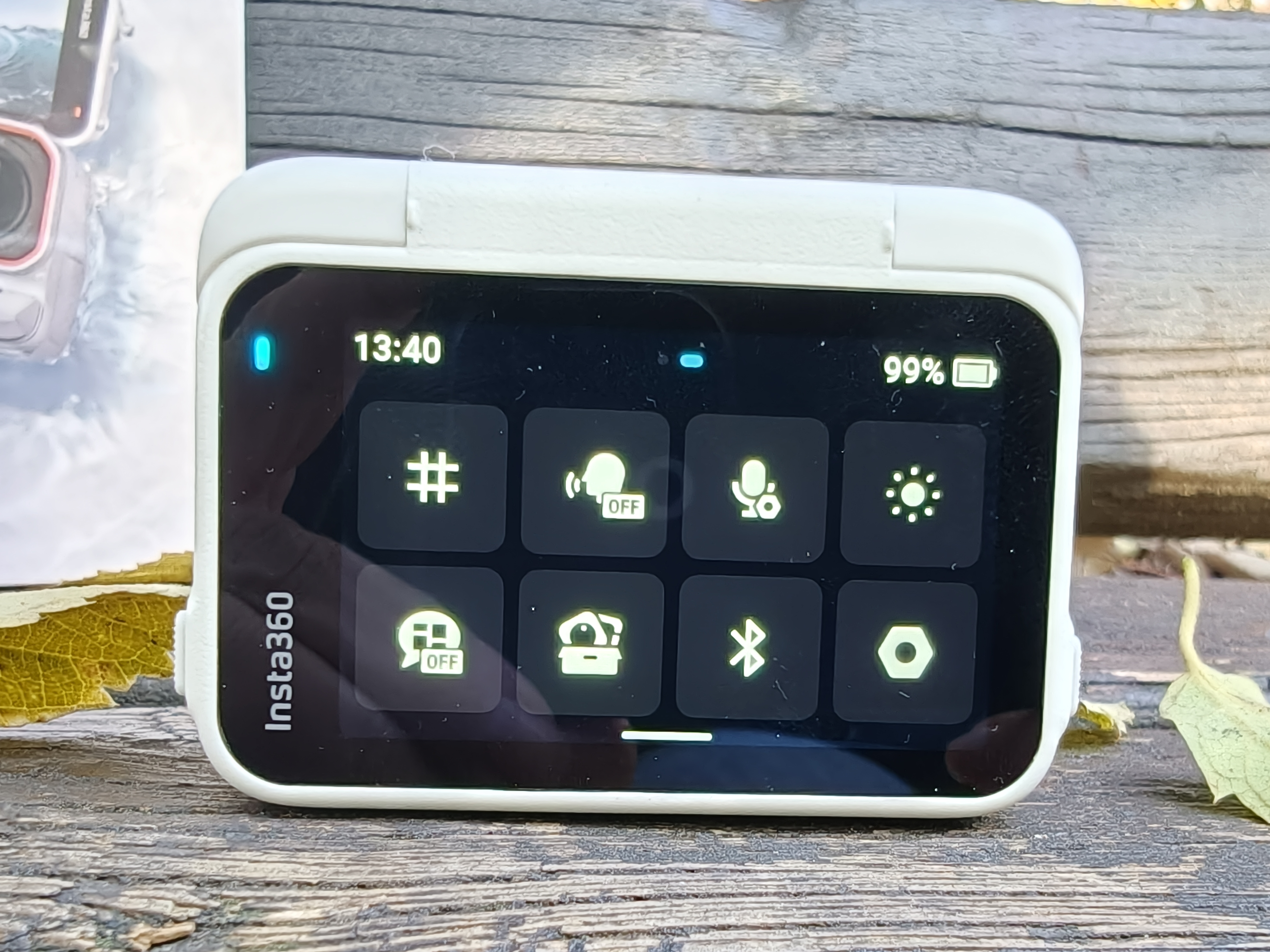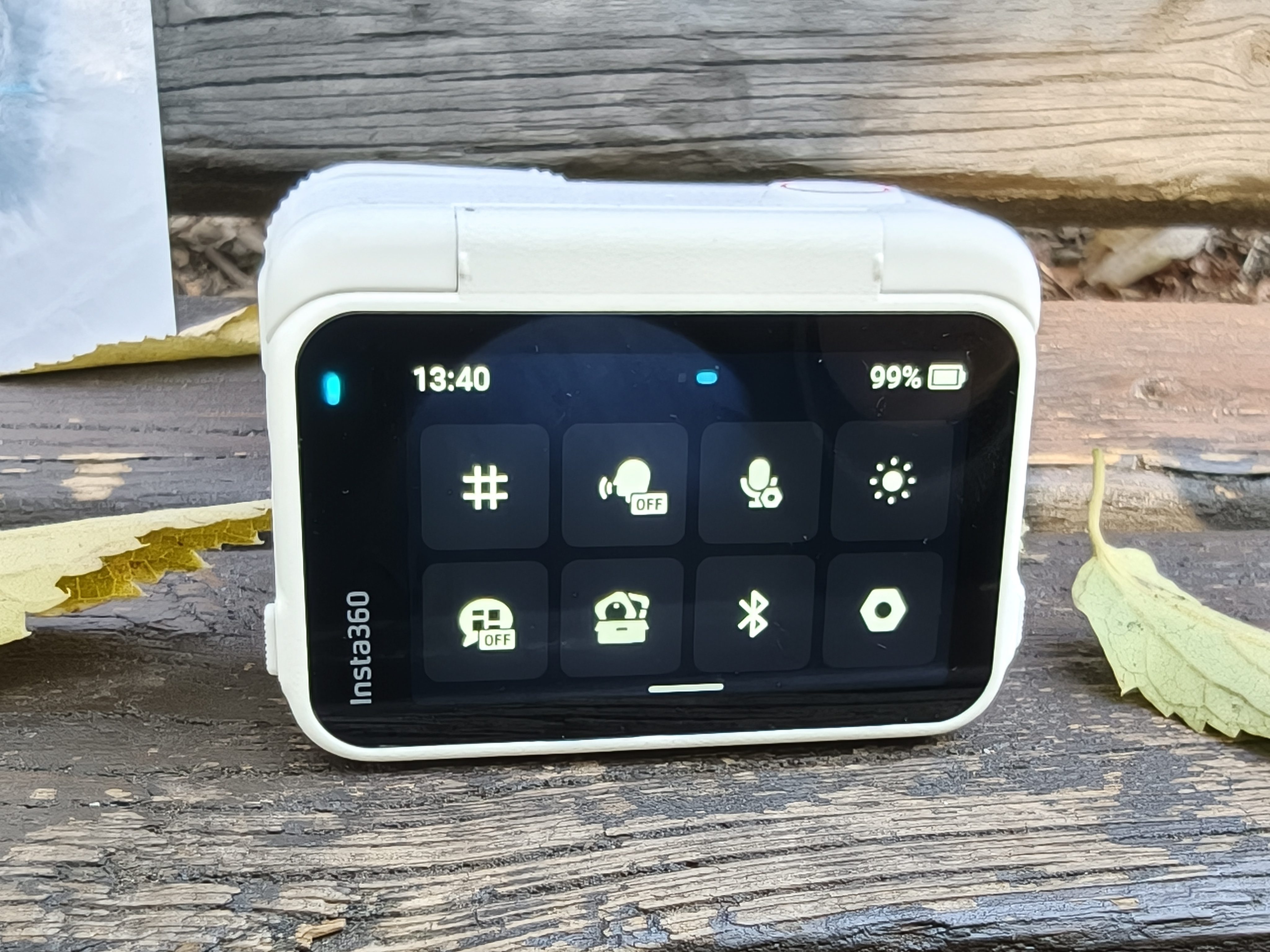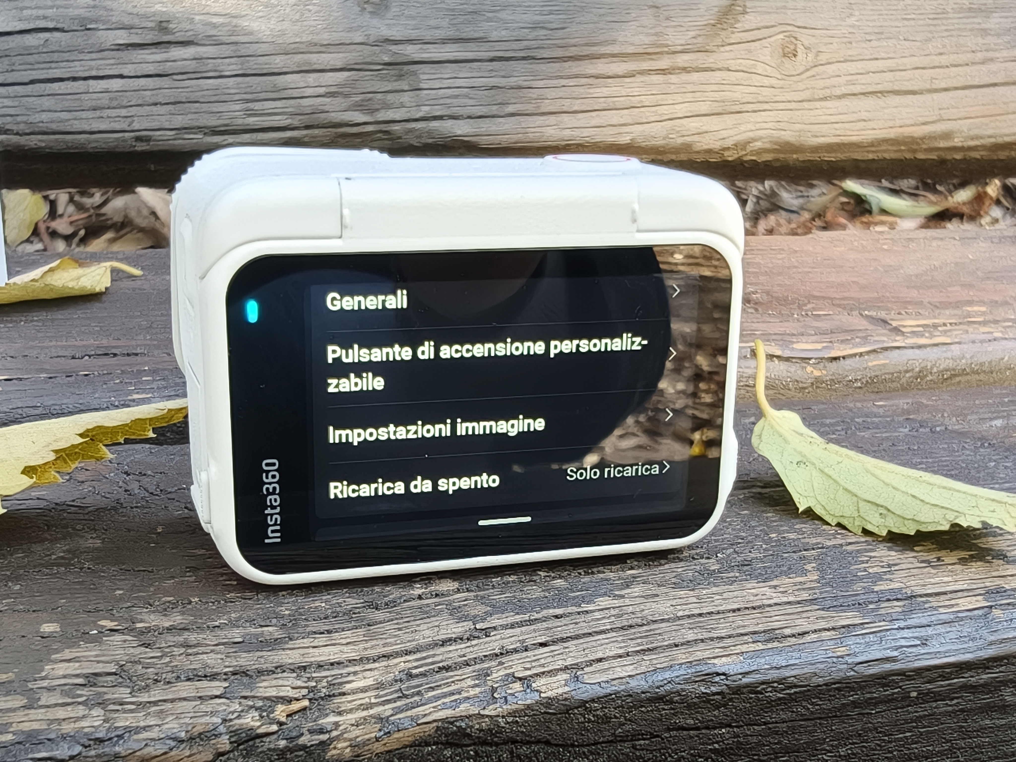Il sistema di controllo è semplice e immediato: due soli pulsanti fisici — quello superiore per lo scatto/registrazione e quello laterale per accensione e cambio modalità — mentre tutto il resto si gestisce via touchscreen o tramite l’app Insta360 mobile. Il menu è chiaro: uno swipe verso il basso apre le impostazioni rapide, a destra la galleria, a sinistra le opzioni della modalità corrente e verso l’alto i parametri avanzati.