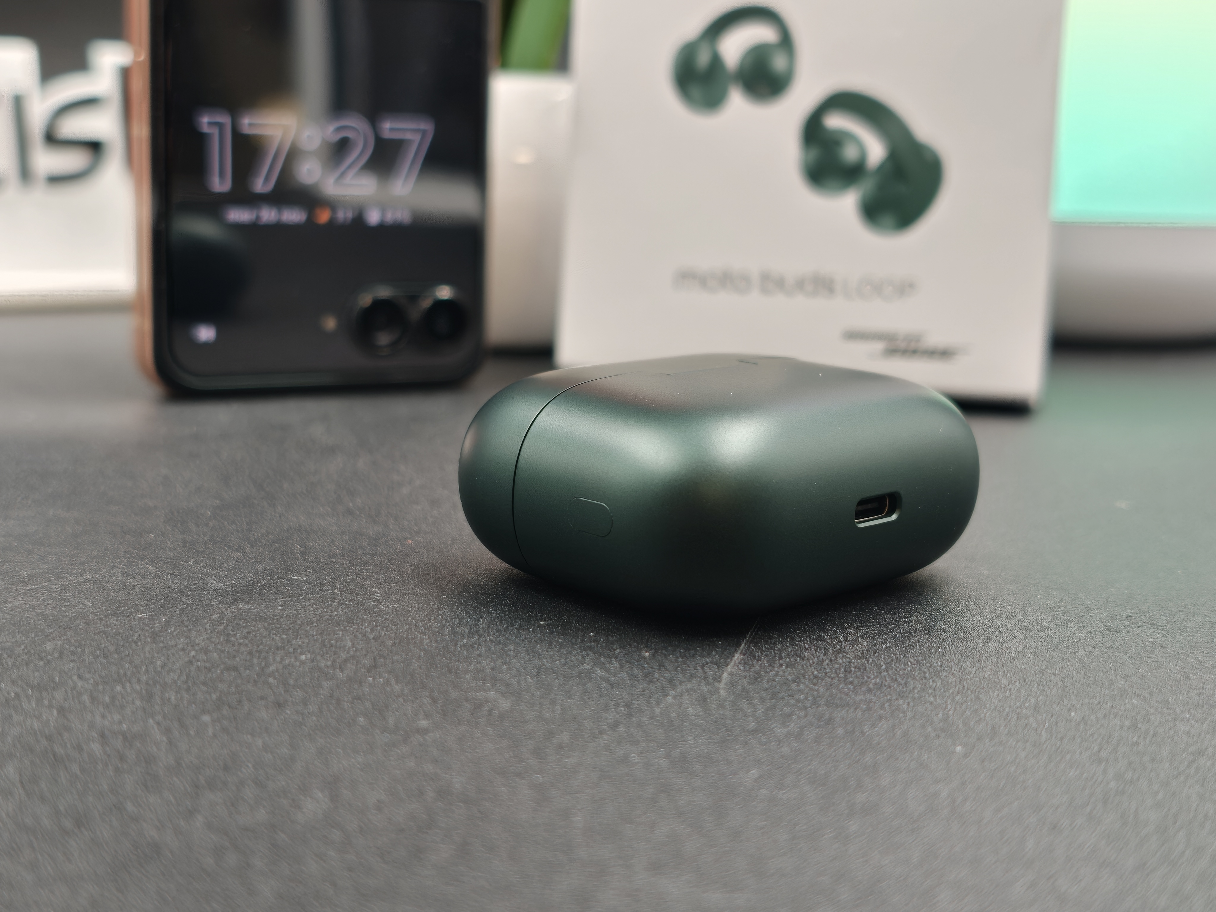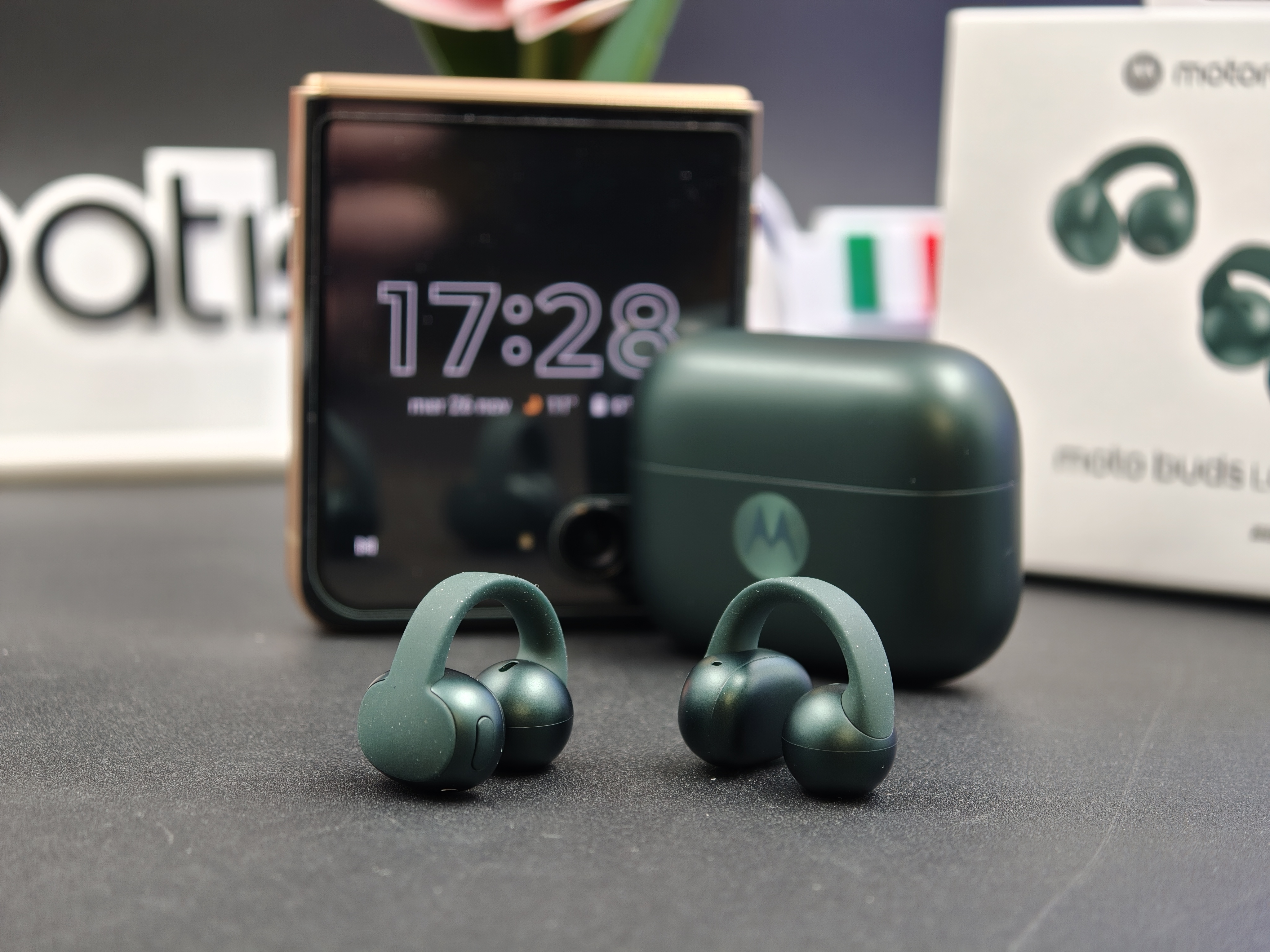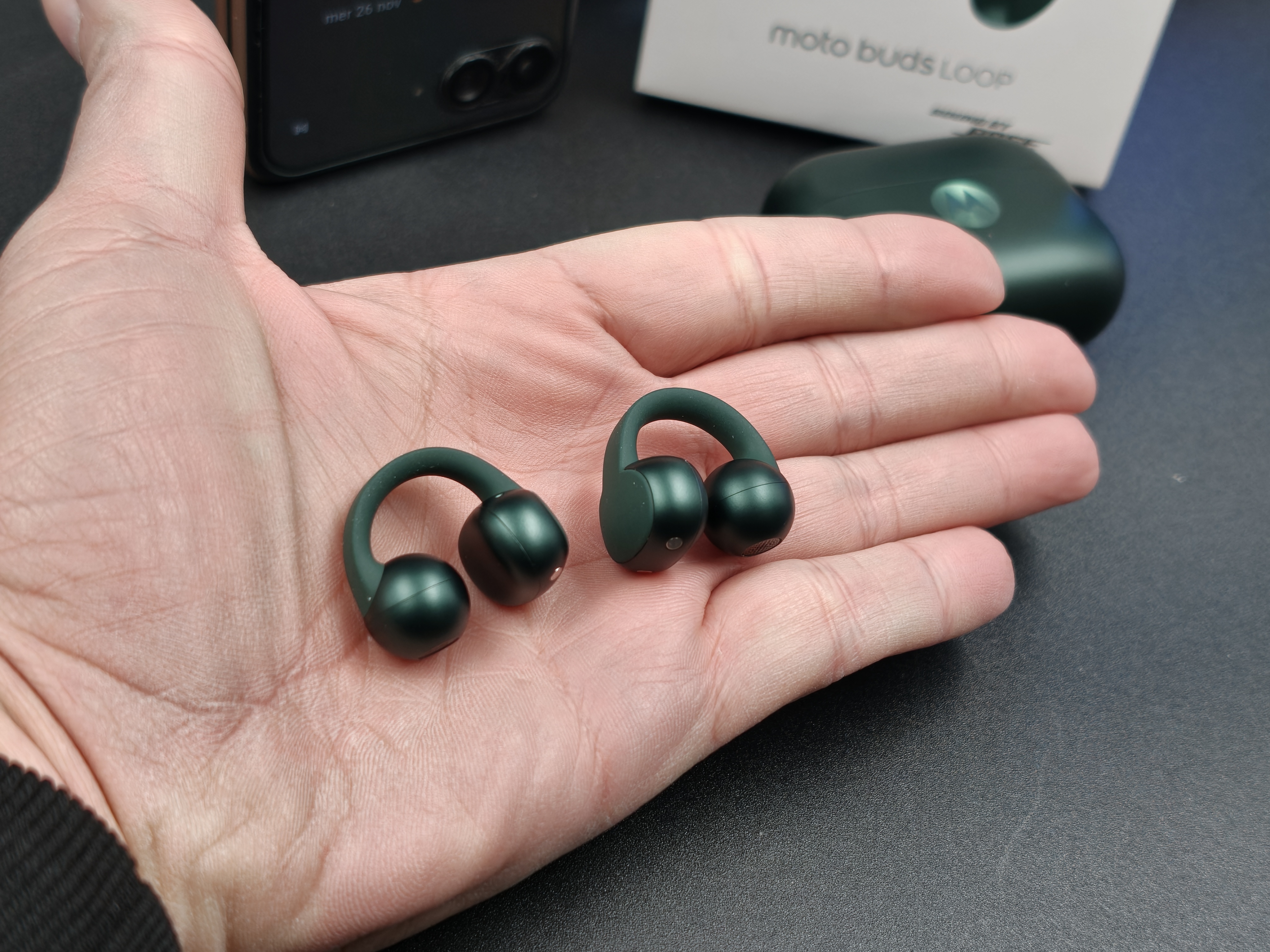 Viste dal vivo, le Moto Buds Loop in PANTONE Trekking Green hanno subito un carattere preciso. Il verde è profondo ma non pacchiano, con una finitura opaca che nasconde bene ditate e piccoli segni. È una colorazione che funziona sia in contesto sportivo sia con look più casual, e si vede chiaramente che Motorola qui ha lavorato insieme a Pantone per dare una certa identità all’oggetto.