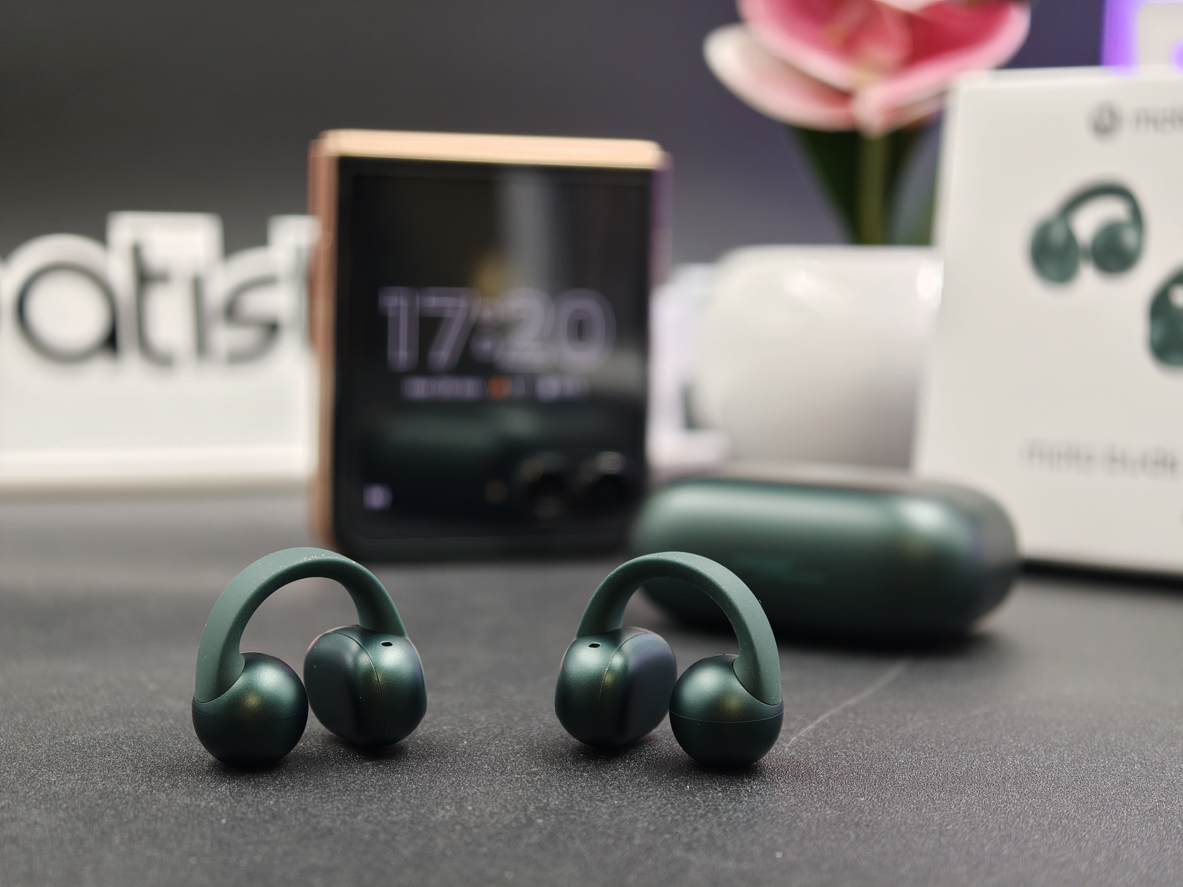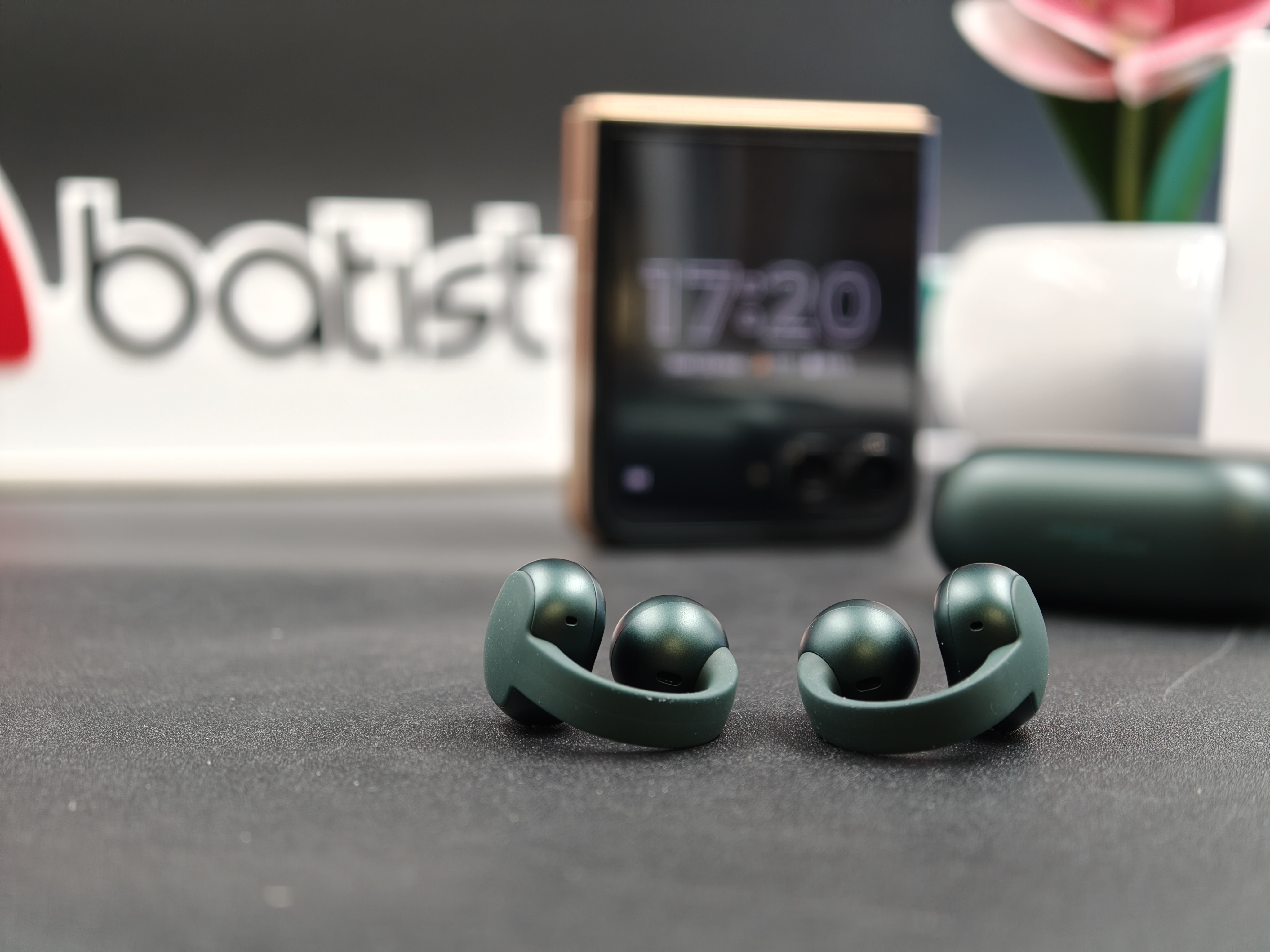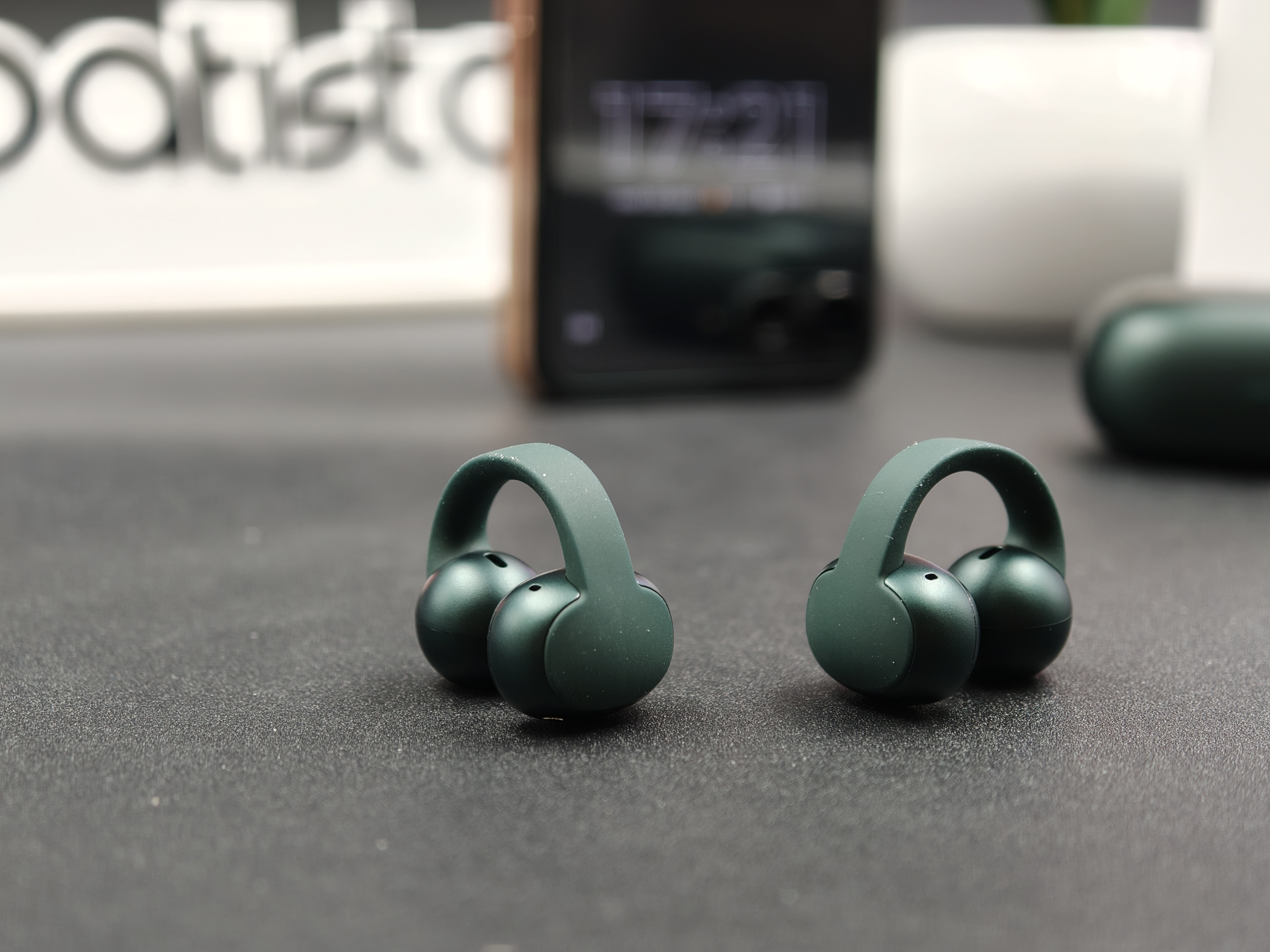 Viste dal vivo, le Moto Buds Loop in PANTONE Trekking Green hanno subito un carattere preciso. Il verde è profondo ma non pacchiano, con una finitura opaca che nasconde bene ditate e piccoli segni. È una colorazione che funziona sia in contesto sportivo sia con look più casual, e si vede chiaramente che Motorola qui ha lavorato insieme a Pantone per dare una certa identità all’oggetto.