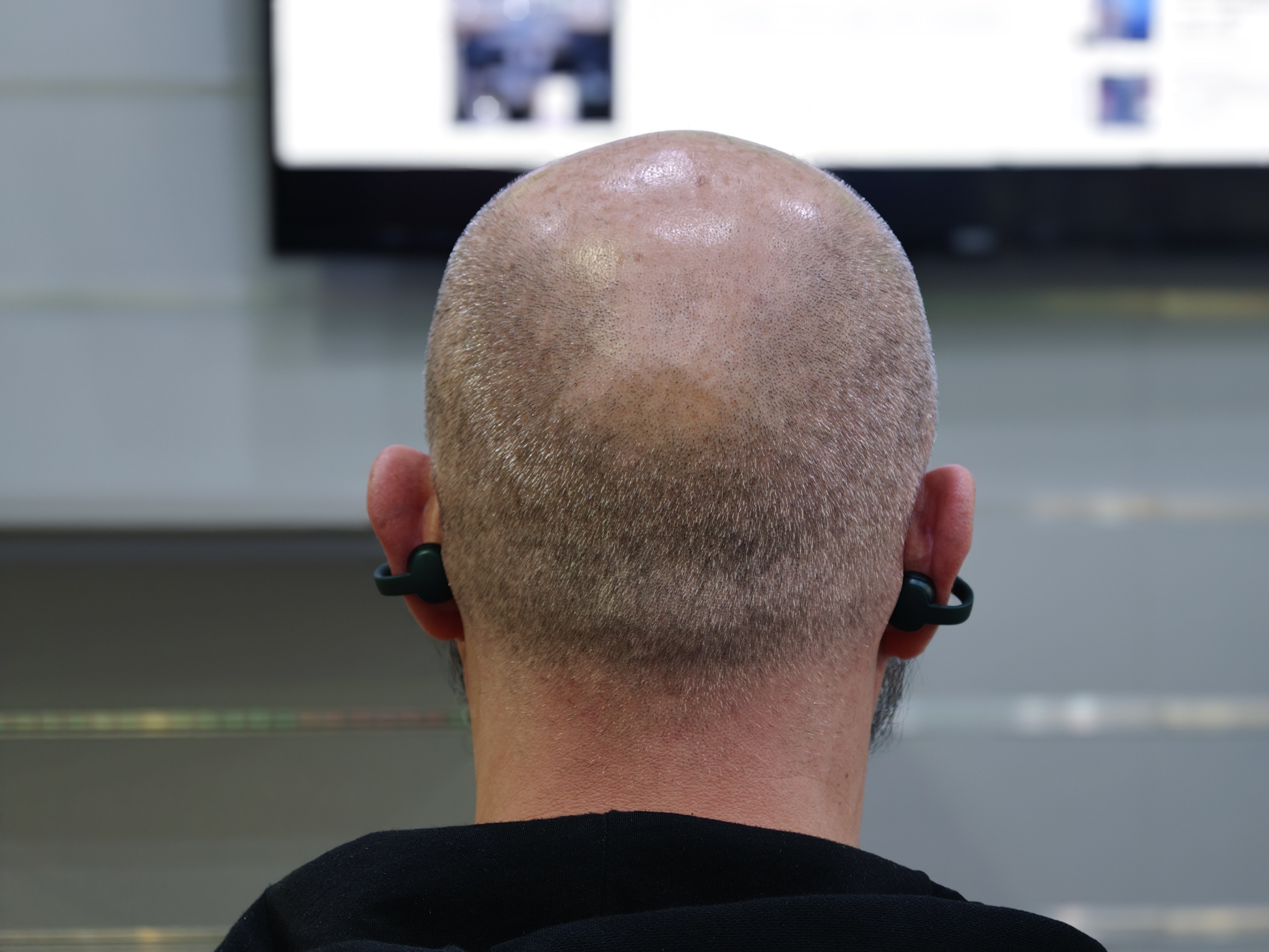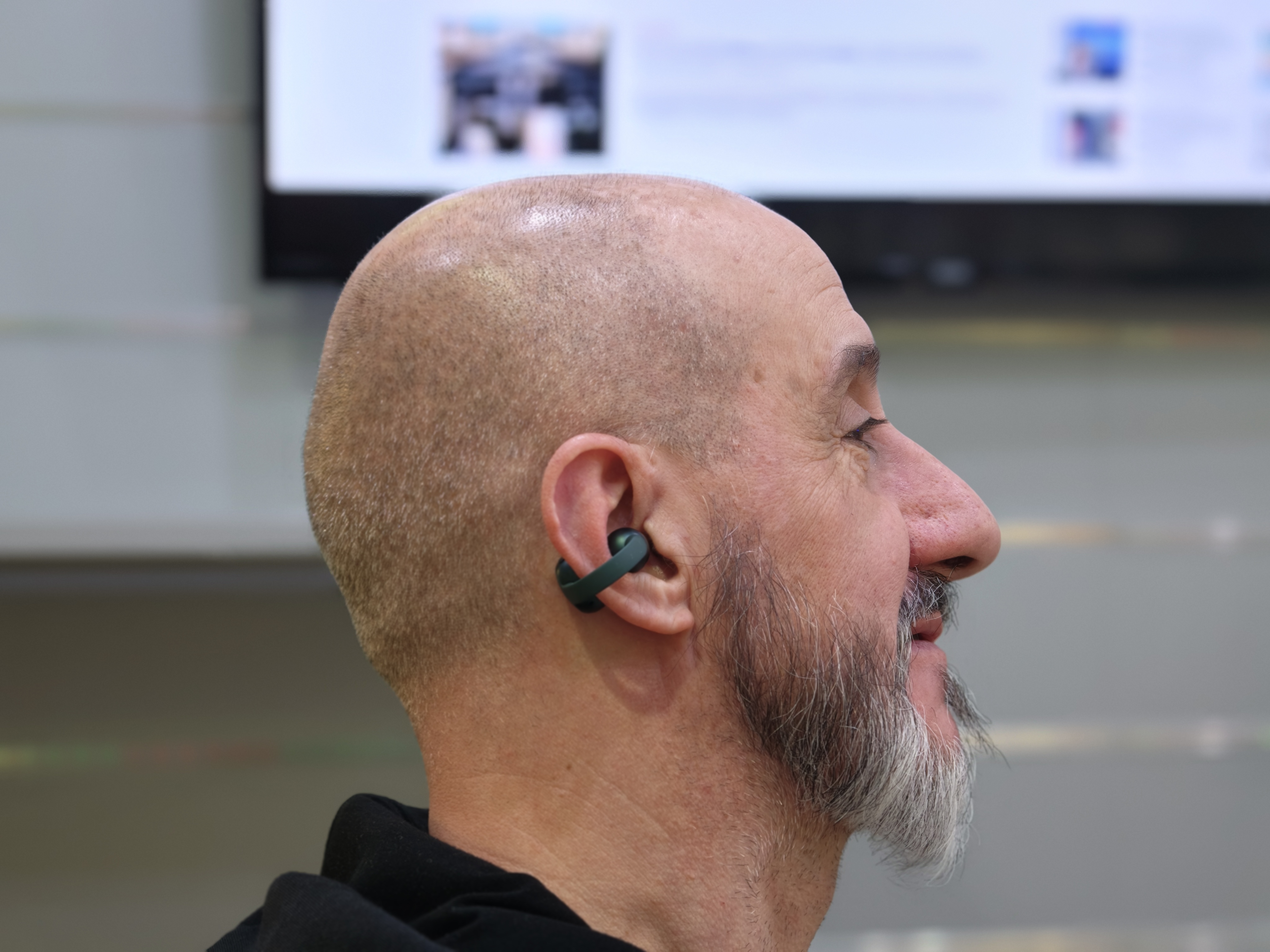 Invece del classico gommino infilato nel condotto uditivo, l’audio arriva da un anello che si appoggia all’orecchio e lascia passare i rumori dell’ambiente. È una soluzione che punta su comfort prolungato e consapevolezza di ciò che accade attorno, più che su isolamento totale e bassi estremi.