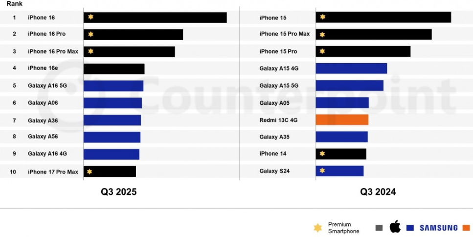 La serie 17 compare comunque in classifica, con l’iPhone 17 Pro Max al decimo posto, nonostante la disponibilità limitata dovuta al debutto a fine settembre.