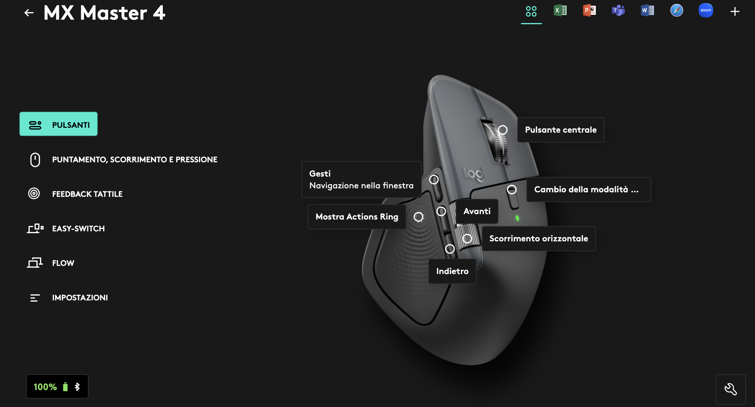 Il software Logi Options+ rappresenta il cuore pulsante dell’esperienza MX Master 4. L’applicazione permette di personalizzare ogni aspetto del mouse: sensibilità del tracciamento, funzione dei pulsanti, intensità del feedback aptico e configurazione di Actions Ring.