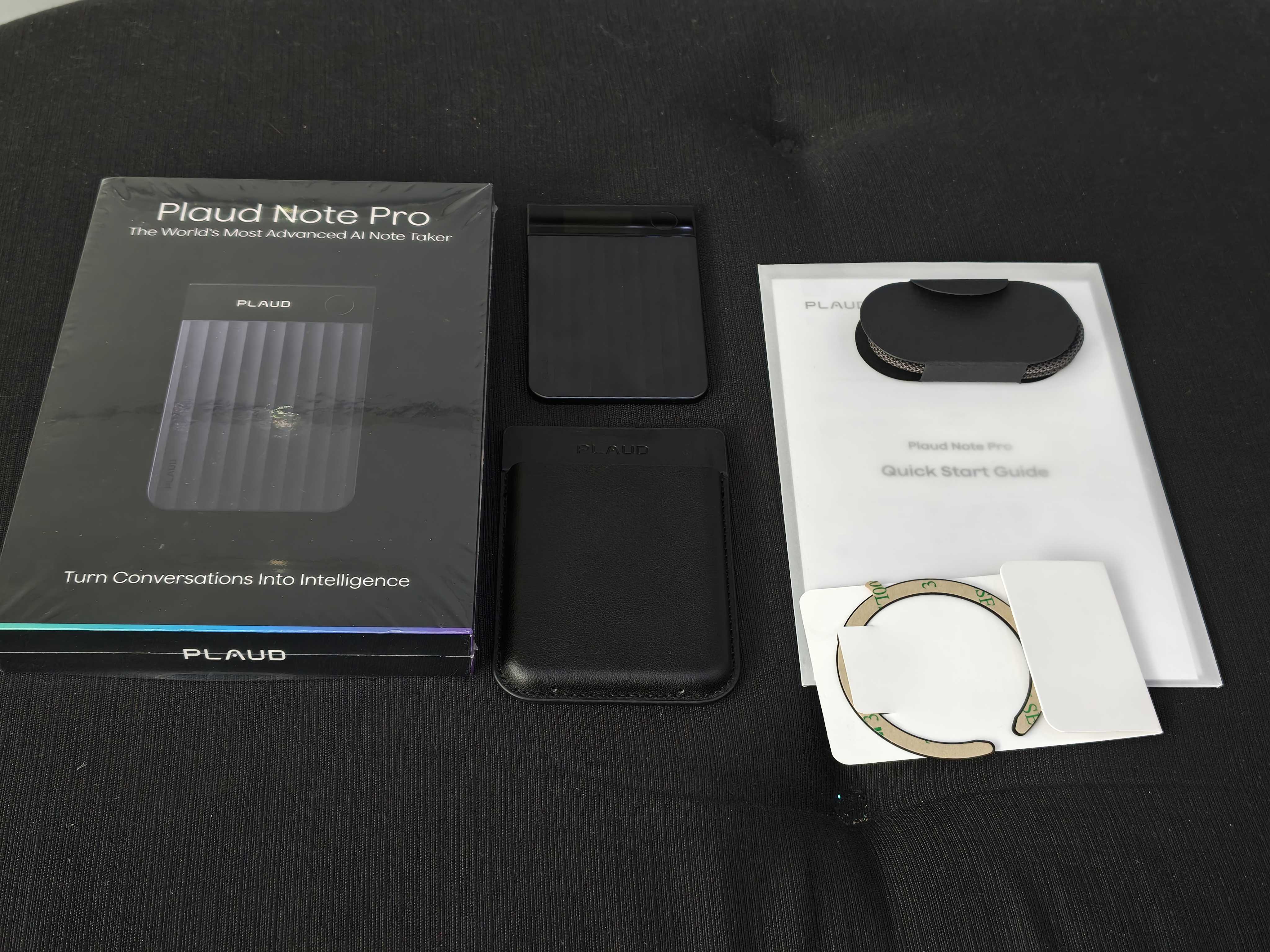 La confezione di Plaud Note Pro è essenziale ma curata, proprio come ci si aspetta da un prodotto di fascia premium. All’interno troviamo il dispositivo, il case in pelle, la clip magnetica in metallo, un cavo USB-C per la ricarica e la guida rapida.