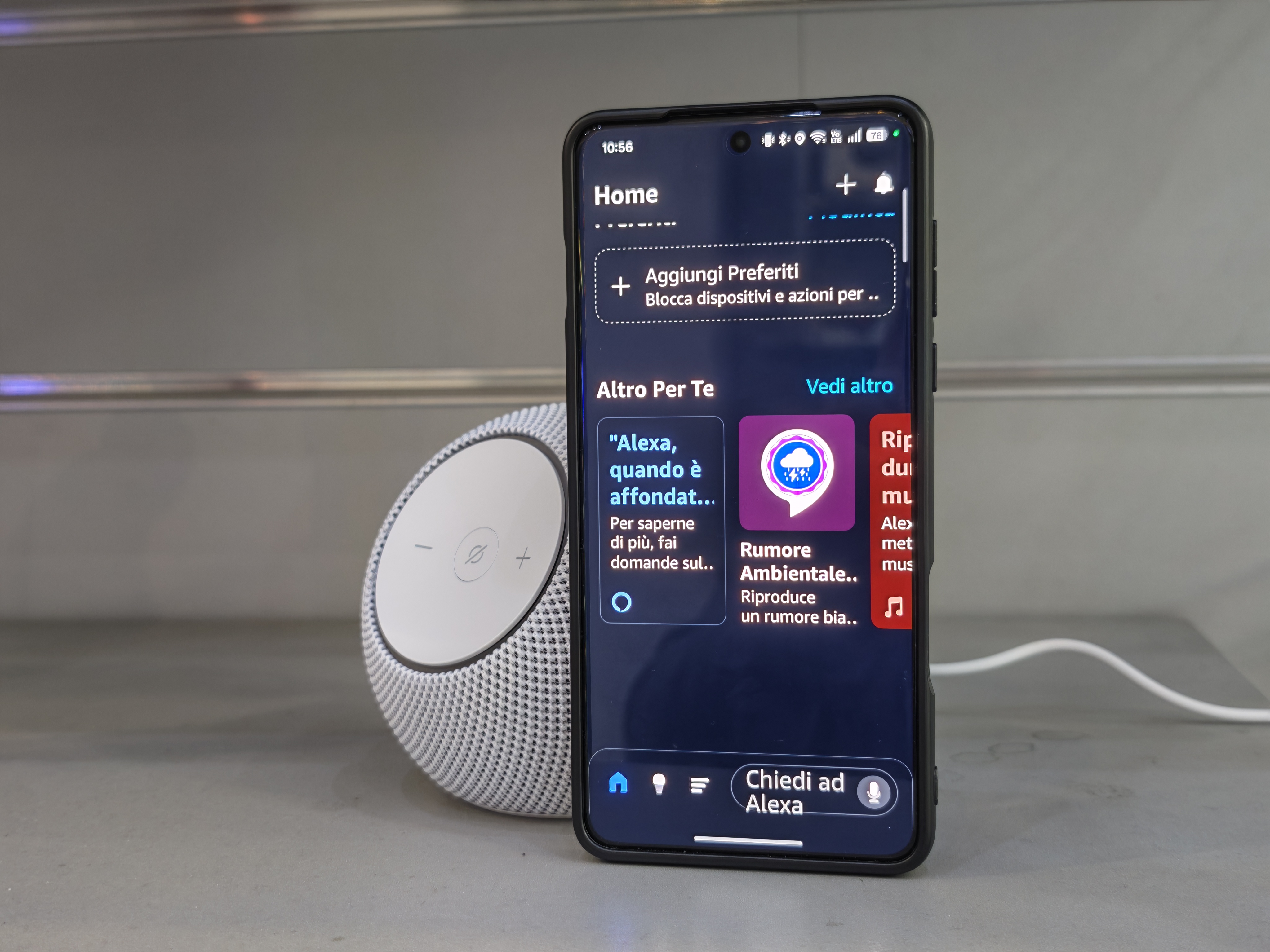 La reattività dei microfoni si è rivelata uno dei vantaggi più concreti. Alexa continua a riconoscere i comandi anche con volume alto, quando stiamo cucinando con rumori di fondo o quando il pc è accesa. In pratica, non dobbiamo mai forzare la voce per farci sentire: una comodità che, nell’uso quotidiano, fa la differenza molto più di quanto si pensi.