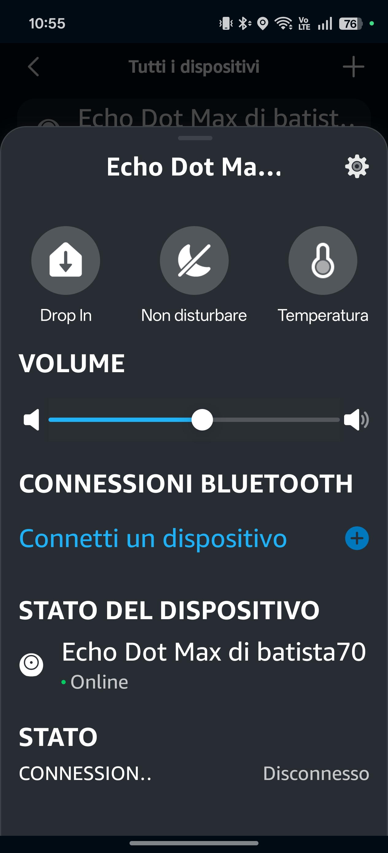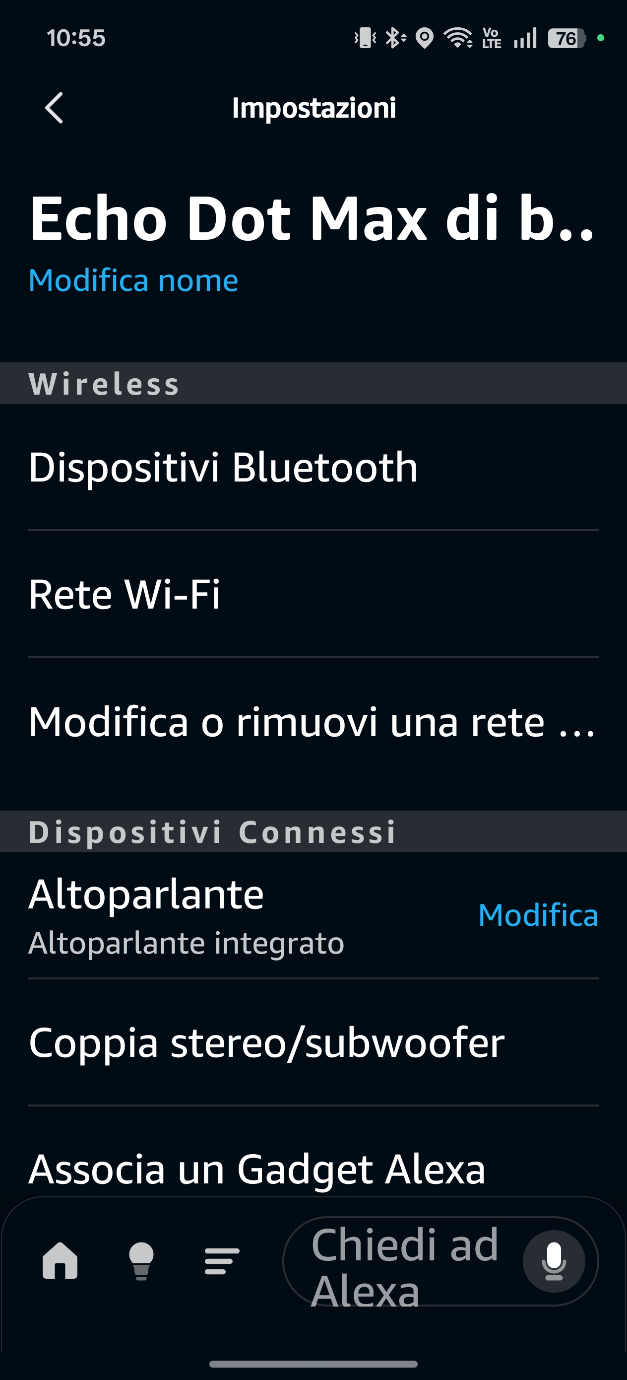 Notevole anche la compatibilità con Wi-Fi 5 e 6/6E, un dettaglio non scontato in questa fascia, che evita problemi su reti più recenti. Nessuna incertezza nemmeno con Bluetooth o con la musica multistanza: Echo Dot Max si collega e resta stabile.