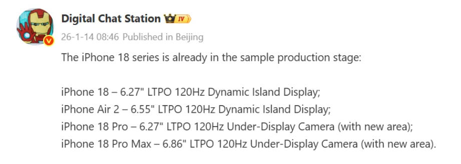 Il cambiamento più significativo, secondo quanto riportato, sarebbe riservato a iPhone 18 Pro e iPhone 18 Pro Max. I due modelli starebbero testando pannelli LTPO a 120 Hz da 6,27 pollici e 6,86 pollici. Fin qui sembra un classico aggiornamento di lineup. La vera novità, però, sarebbe la gestione dei componenti frontali.