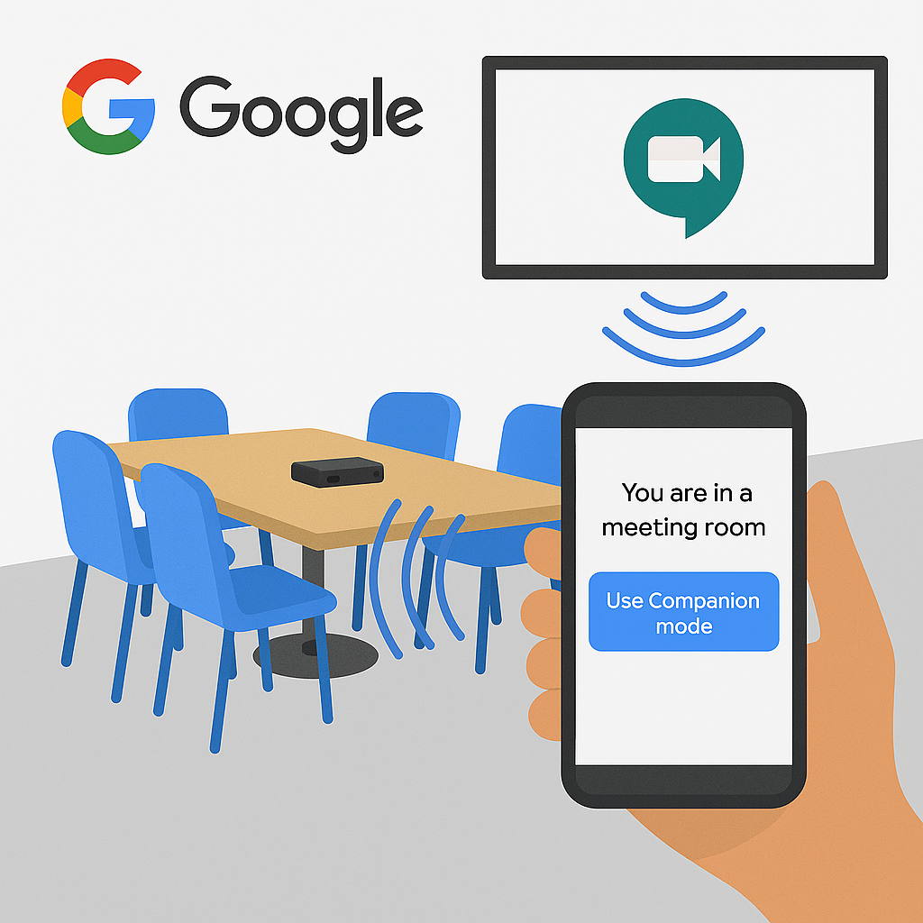 In pratica l’applicazione si basa su segnali ultrasonici silenziosi emessi da hardware per sale riunioni compatibili. Questi suoni sono impercettibili, ma possono essere rilevati dal microfono del telefono. Una volta che il telefono rileva il segnale, Meet riconosce che la posizione è in una stanza specifica. Di conseguenza visualizza automaticamente un’opzione per la modalità Companion.