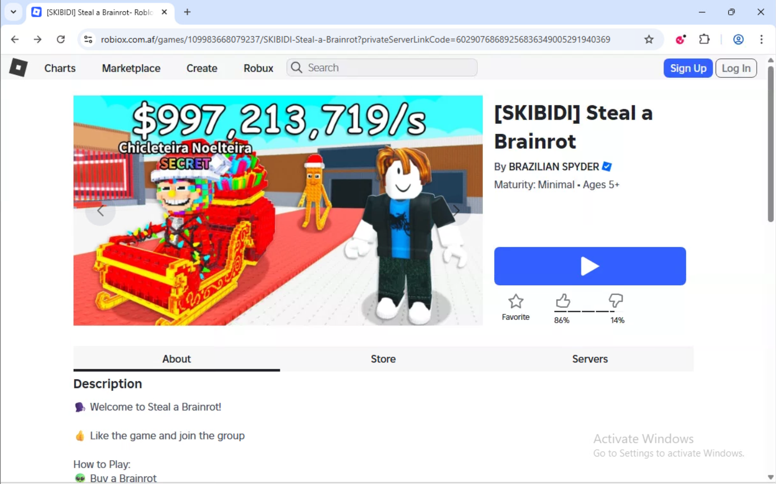 La pagina di destinazione presentava un gioco Roblox fasullo intitolato “SKIBIDI Steal a Brainrot”. Questo era completo di immagini realistiche, valutazioni e un pulsante “Gioca” ben visibile. Il contenuto imitava da vicino uno dei giochi più popolari attualmente disponibili sulla piattaforma Roblox, progettato per attirare i bambini, target della piattaforma.