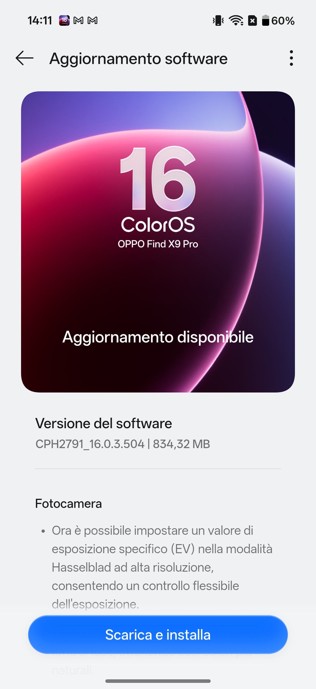 ColorOS 16 Find X9: update 16.0.3.504 in Italia