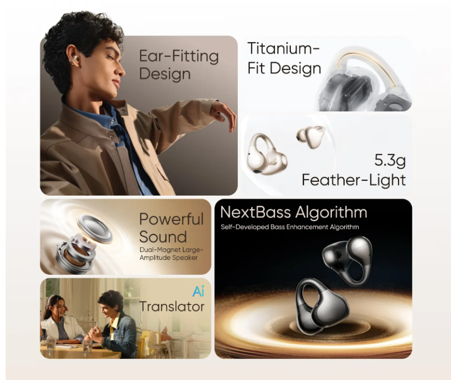 Gli open-ear hanno una sfida storica: i bassi. Se non sigilli il condotto, perdi pressione e corpo. realme prova a risolvere con una regolazione intelligente basata sull’algoritmo NextBass. Quindi il sistema lavora per mantenere profondità e impatto, anche con un design aperto. Inoltre, l’obiettivo è evitare un suono “magro”, tipico di alcuni auricolari open.