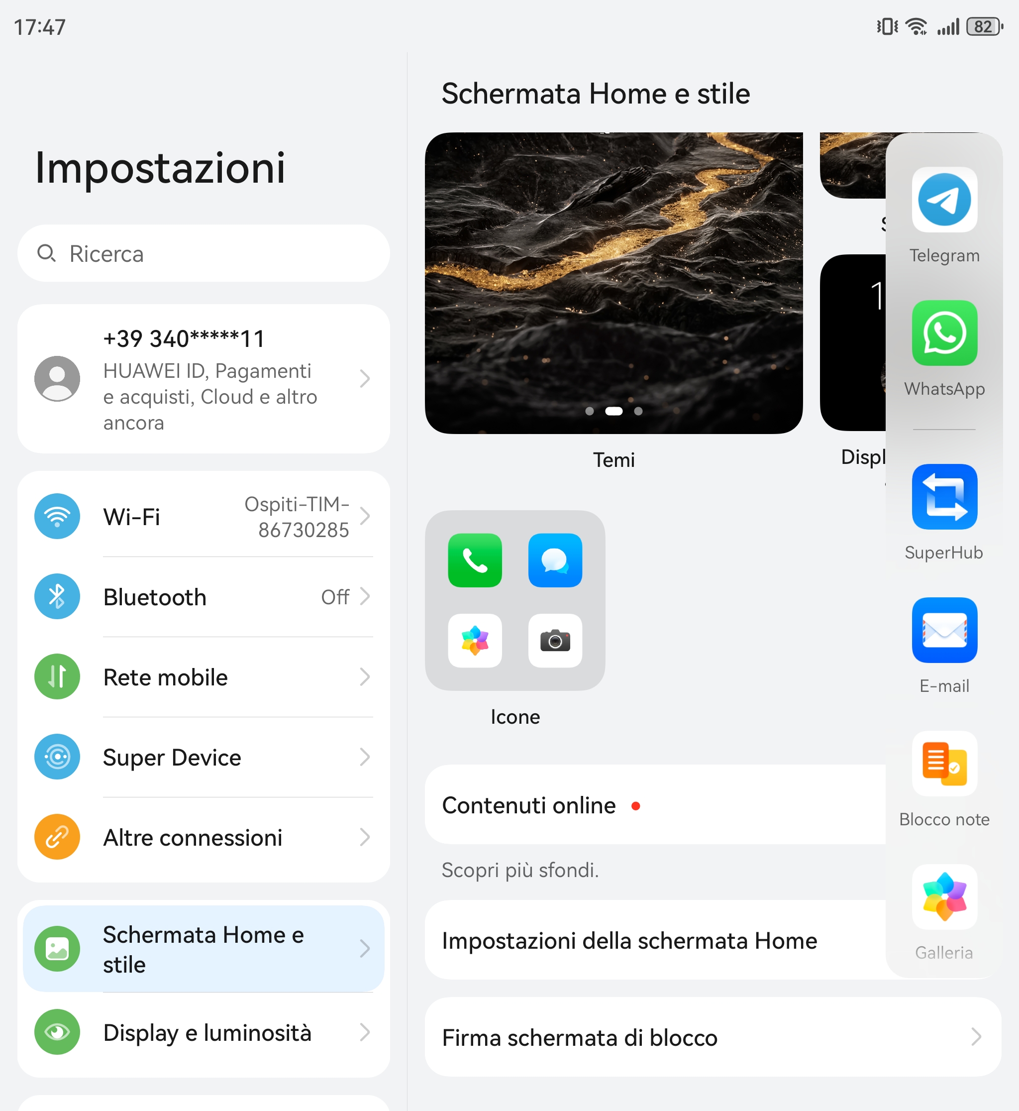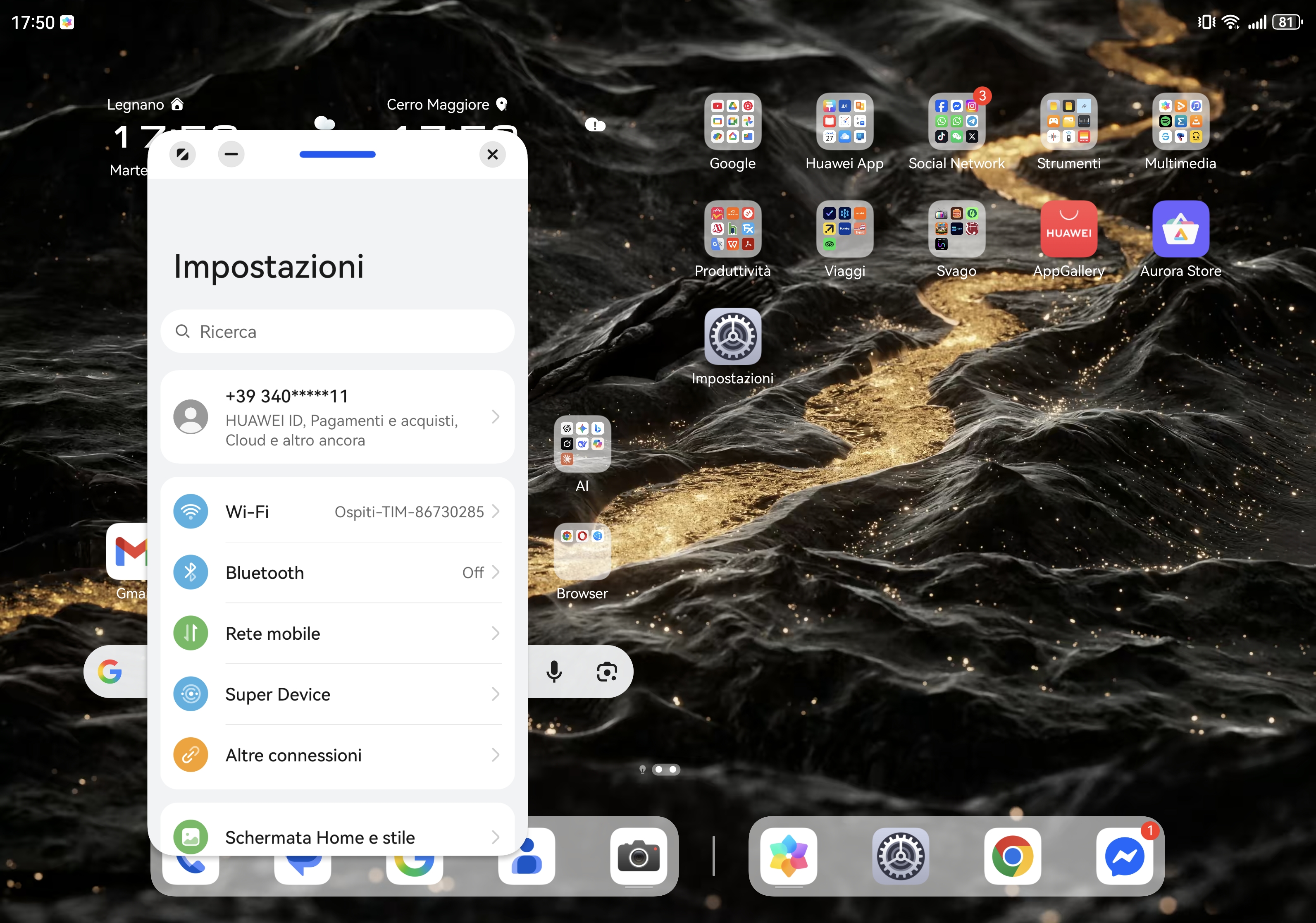 Qui, più che altrove, Mate XT Ultimate si gioca il suo senso. Perché su un tri-fold non basta “avere lo schermo grande”; serve un software che sappia usarlo. La nostra unità, nella versione globale, gira con EMUI 14.2; in Cina, invece, si parla di HarmonyOS 4.2. In generale, l’interfaccia Huawei è quella che molti di voi già conoscono: pulita, familiare, senza rivoluzioni inutili; e soprattutto piena di piccole funzioni pratiche.