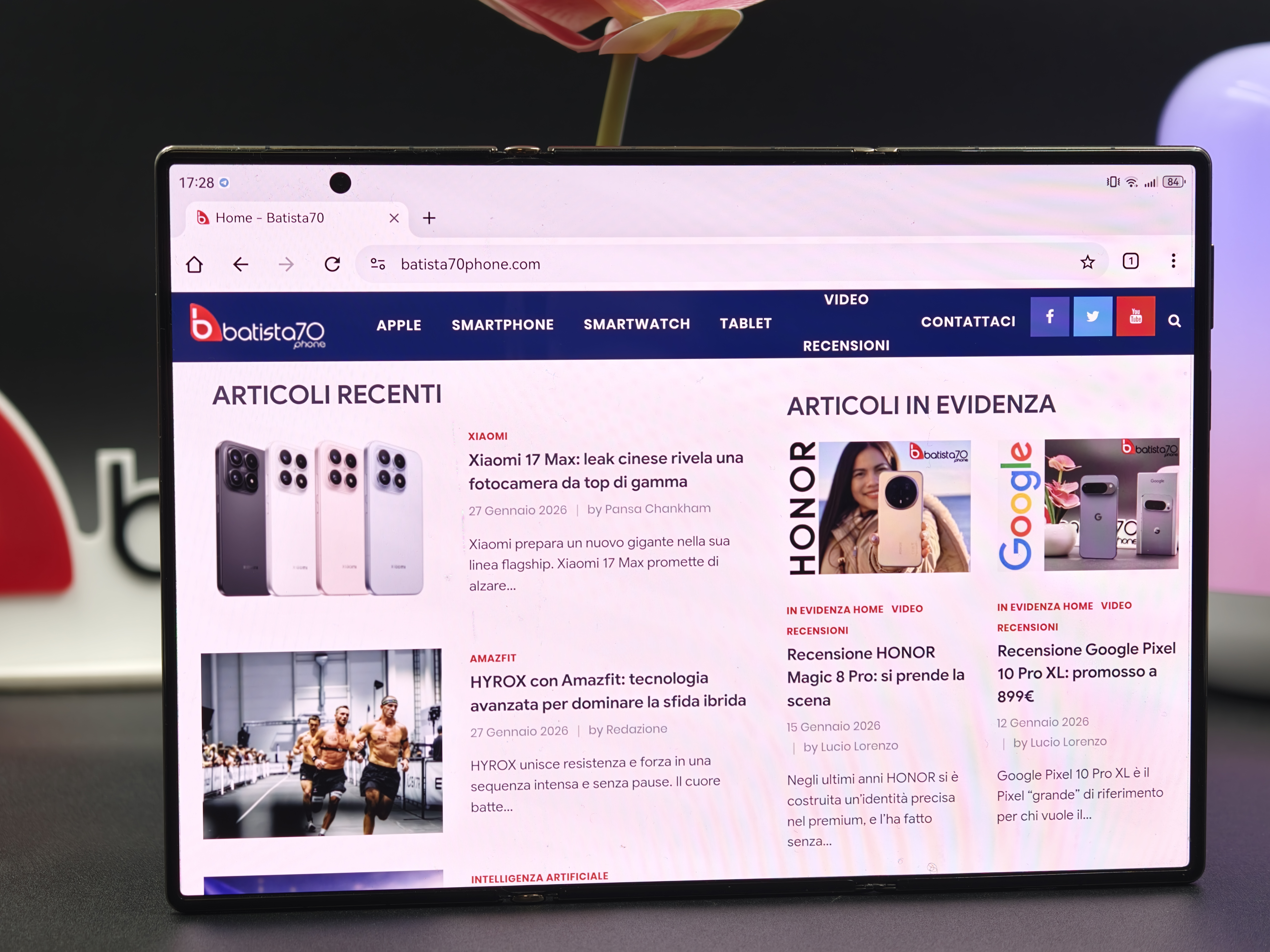 Sì, ve lo diciamo sinceramente: nell’uso quotidiano lo abbiamo sfruttato più da smartphone e da pieghevole tradizionale che da tablet. Ed è normale. Da chiuso è comodo, immediato, e vi porta a fare tutto come fareste con un top classico. La modalità intermedia, poi, è quella che usate più spesso quando volete “qualcosa in più” senza aprirlo del tutto: lettura, mail, web, social, un po’ di lavoro. Il tablet da 10,2 pollici lo abbiamo usato meno, ma ogni volta che lo aprite completamente vi strappa comunque quel sorriso; è figo, punto. E soprattutto è utile quando serve davvero spazio: video, documenti, multitasking, controllo delle foto.