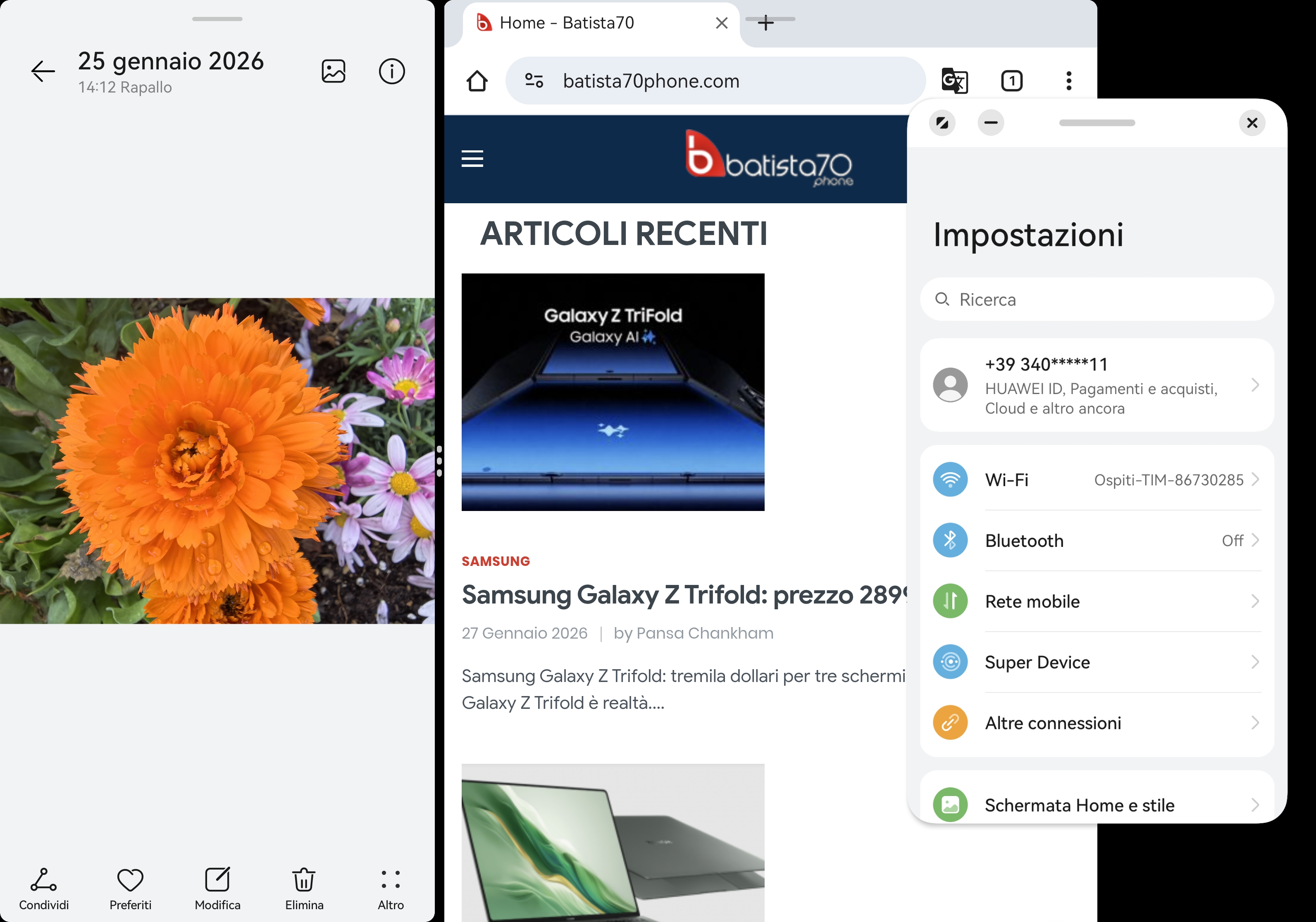 Detto questo, la parte più interessante è come EMUI si comporta con le tre modalità di schermo. Perché qui il tri-fold deve essere fluido, altrimenti perde senso. E la buona notizia è che le transizioni tra 1/3, 2/3 e 3/3 sono naturali: aprite, richiudete, cambiate formato; e l’interfaccia vi segue senza farvi percepire “il passaggio” come un trauma. È esattamente quello che vi serve per usare un tri-fold tutti i giorni.