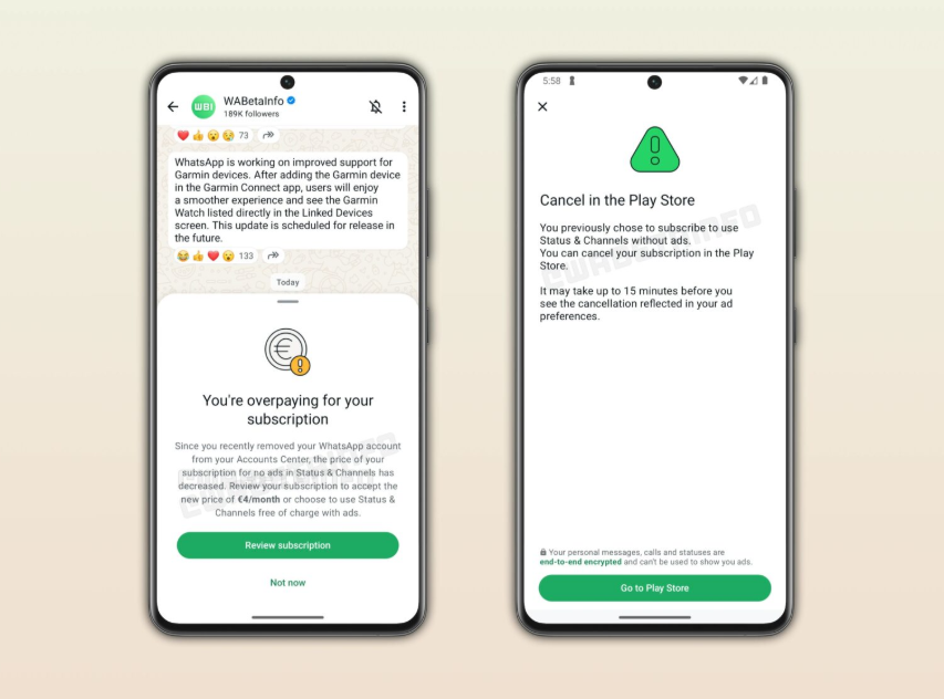 L’abbonamento da 4 euro/mese si gestisce tramite acquisti in-app Google Play. L’attivazione richiede fino a 15 minuti. Non è chiaro se sarà un abbonamento standalone WhatsApp o integrato nel Meta Accounts Center (Facebook+Instagram+WhatsApp).