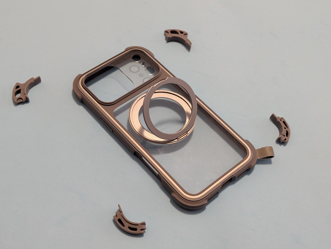 La struttura integra componenti in TPU, policarbonato, lega di alluminio, nylon e magneti al neodimio. Tuttavia, nonostante l’utilizzo di materiali robusti, il peso complessivo della cover si mantiene contenuto: solo 65 grammi, a cui si aggiungono 100 grammi per il lanyard incluso nella confezione.