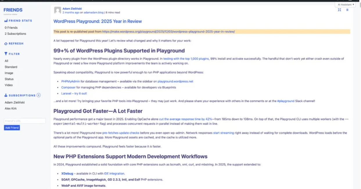 Oltre all’editor nativo, my.WordPress.net mette a disposizione una selezione di plugin con cui interagire direttamente nell’ambiente browser. Tra questi spicca un lettore RSS personale, utile per aggregare fonti e seguire notizie direttamente all’interno dello spazio WordPress, e un assistente basato sull’intelligenza artificiale che supporta la scrittura e l’organizzazione dei contenuti. Si tratta di strumenti leggeri ma concreti, che ampliano le possibilità dell’ambiente oltre la semplice scrittura di testo.