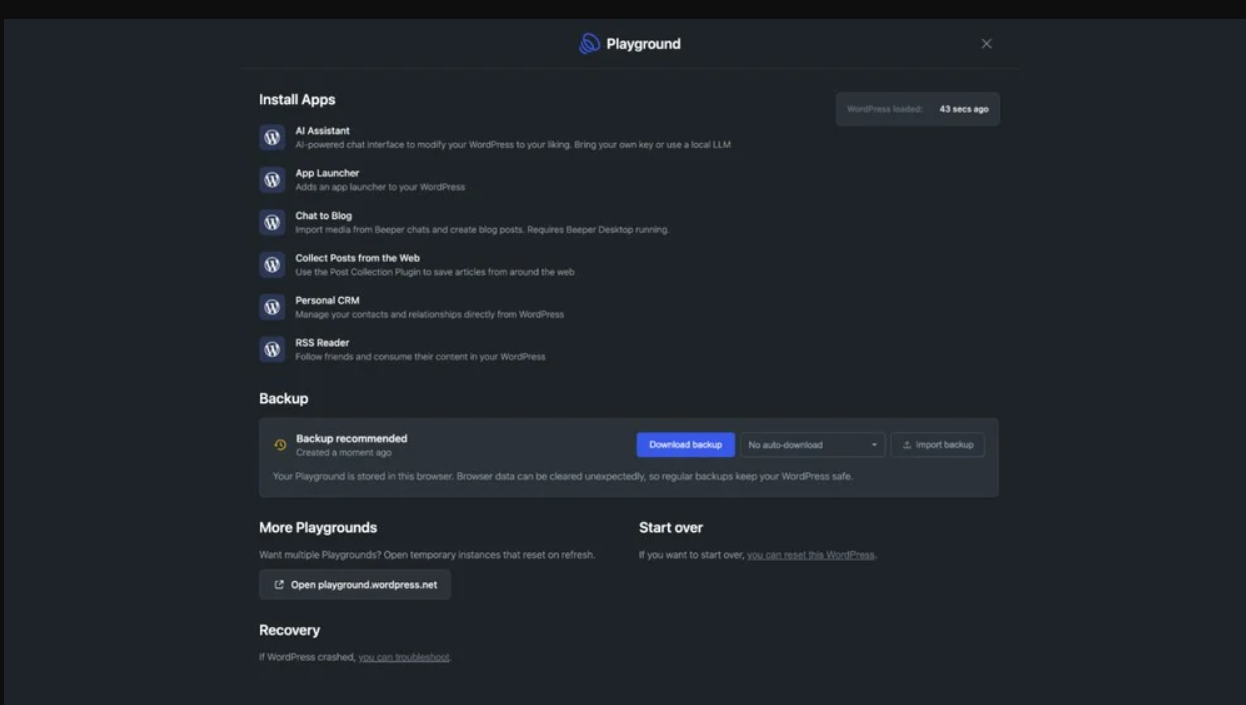 Il funzionamento è semplice quanto il concetto: WordPress viene eseguito interamente all’interno del browser dell’utente. I dati non vengono caricati su server esterni, non transitano su cloud di terze parti e non richiedono sincronizzazione con account online. Tutto rimane in locale, salvato nella memoria del browser come avviene con le applicazioni Progressive Web App. Questo approccio garantisce una privacy completa per i contenuti creati: nessuno, al di fuori dell’utente, ha accesso a ciò che viene scritto o sperimentato all’interno dell’ambiente.