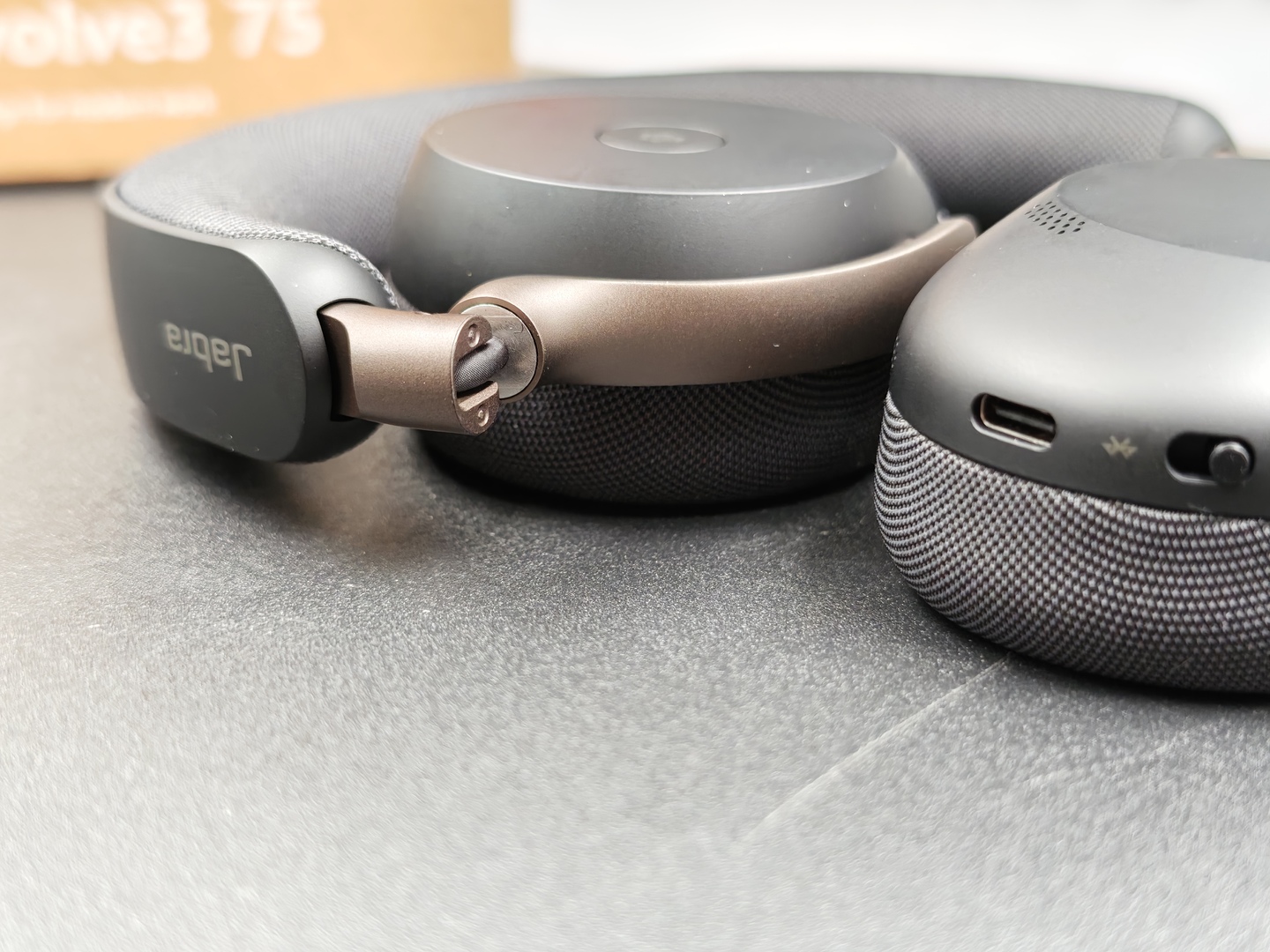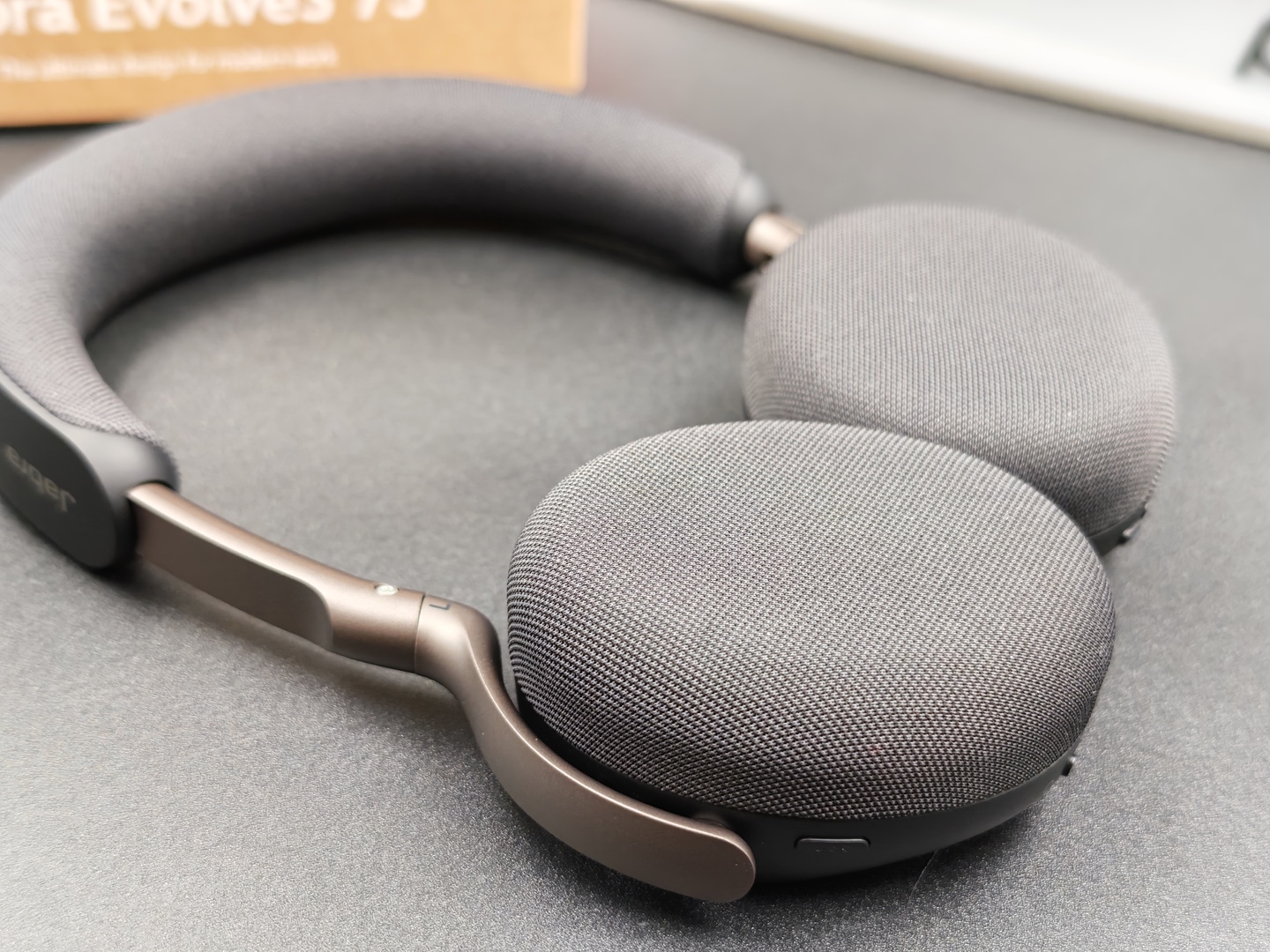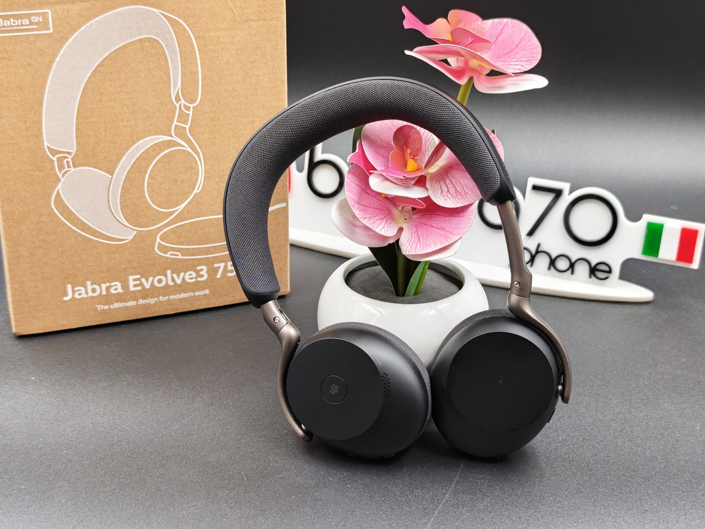 Un altro dettaglio importante è l’assenza del classico microfono a braccetto. Questo rende Jabra Evolve3 75 molto più discreta e molto meno “cuffia da call center” nell’aspetto. È una scelta che sul piano visivo funziona bene e che aiuta il prodotto a sembrare più versatile, più facile da usare anche fuori da una postazione fissa.