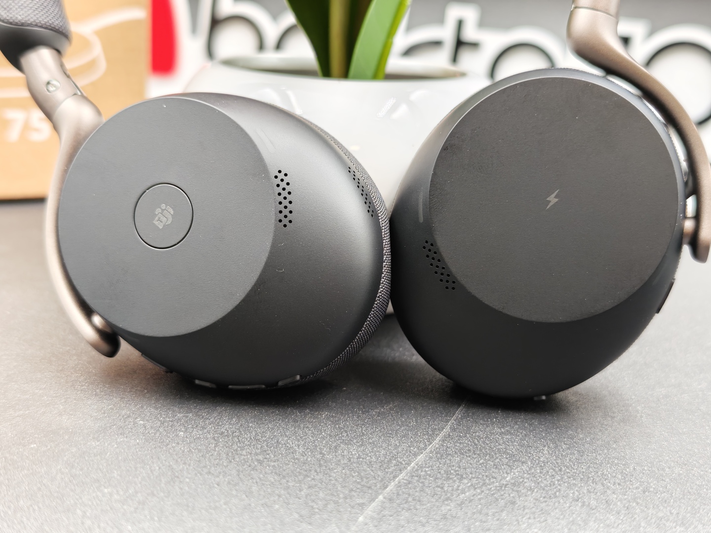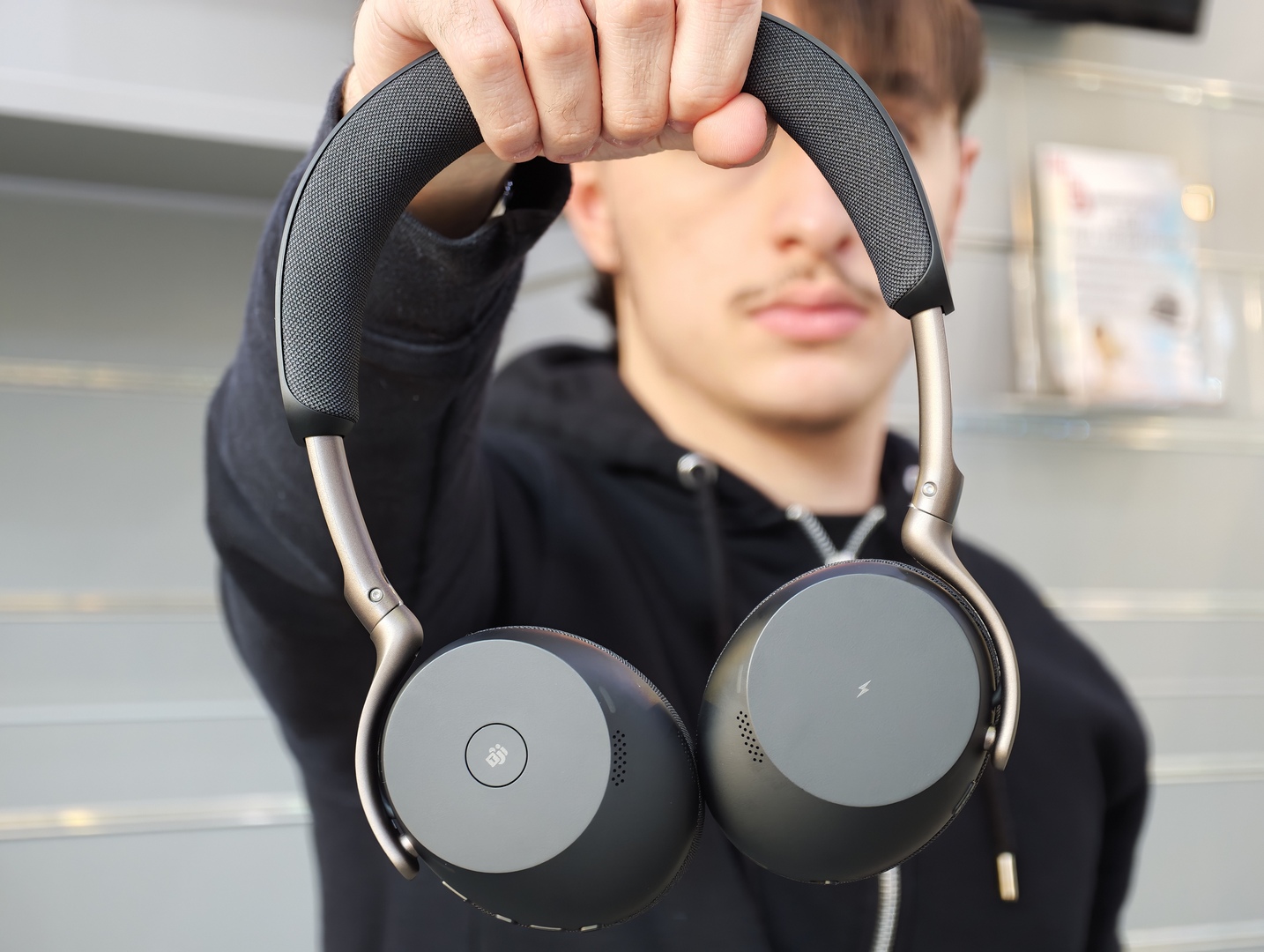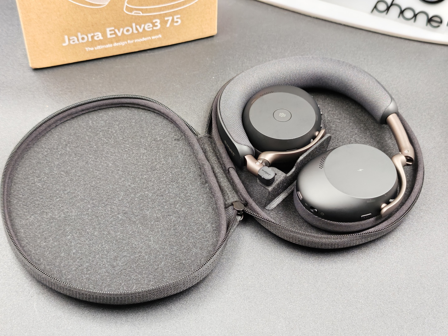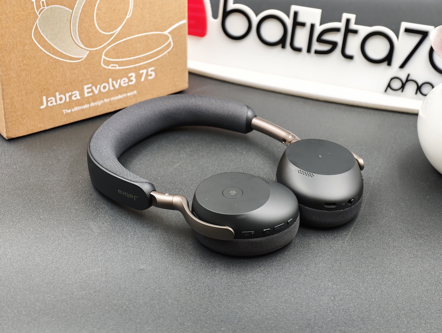 Un altro dettaglio importante è l’assenza del classico microfono a braccetto. Questo rende Jabra Evolve3 75 molto più discreta e molto meno “cuffia da call center” nell’aspetto. È una scelta che sul piano visivo funziona bene e che aiuta il prodotto a sembrare più versatile, più facile da usare anche fuori da una postazione fissa.
