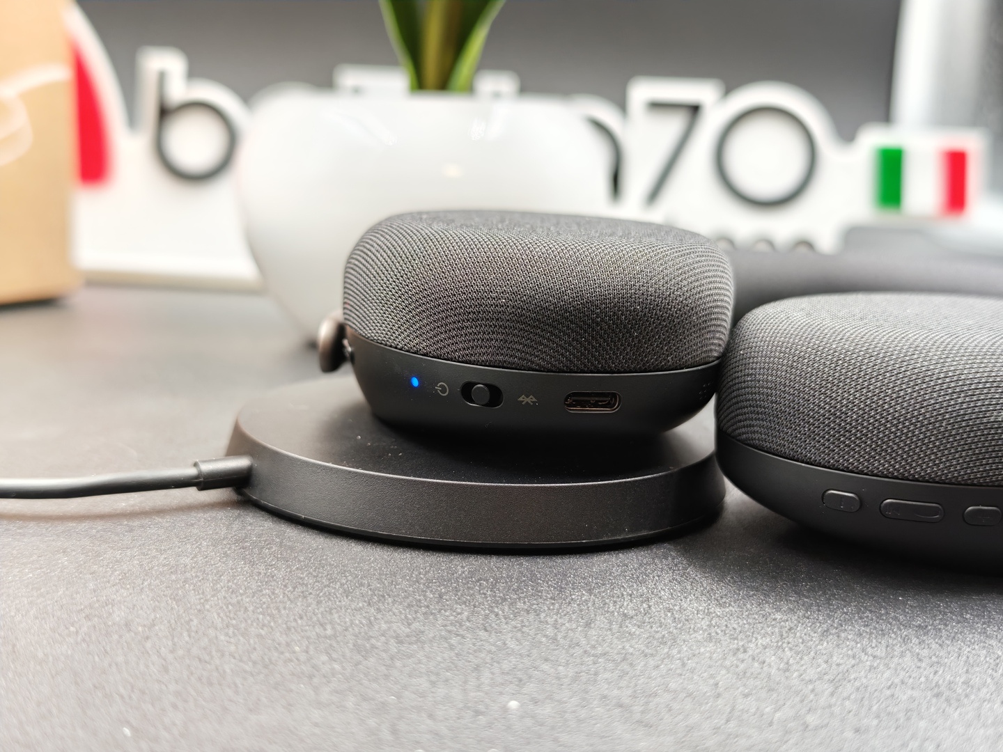 Completano il quadro i comandi fisici ben integrati e alcuni dettagli pensati chiaramente per il lavoro, come i LED di stato e i pulsanti dedicati a chiamate, volume, mute e gestione delle modalità audio. In più c’è la USB-C per la ricarica e anche la possibilità di sfruttare la ricarica wireless Qi, una comodità non scontata in questa categoria.