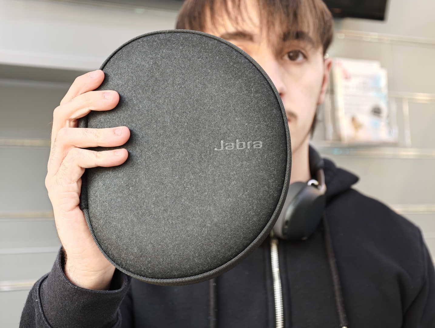 Molto bene anche la parte legata al trasporto. Jabra Evolve3 75 è una cuffia compatta, si piega bene e occupa poco spazio nella custodia. Dal punto di vista tecnico è un vantaggio reale, perché riduce l’ingombro in borsa o nello zaino e la rende più adatta a un uso ibrido, tra postazione fissa, smart working e spostamenti. Non è solo una questione estetica: una struttura più compatta e ben richiudibile significa anche maggiore praticità quotidiana, tempi più rapidi quando la si ripone e meno ingombro rispetto a molte alternative più voluminose.