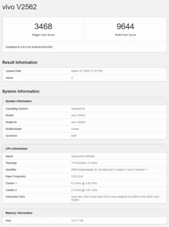 Il modello globale del vivo X300 Ultra è stato individuato con sigla V2562. La scheda benchmark indica la presenza del nuovo Snapdragon 8 Elite Gen 5, accompagnato da 16 GB di RAM e da Android 16. È una configurazione da vero top di gamma e conferma il posizionamento molto alto del dispositivo.