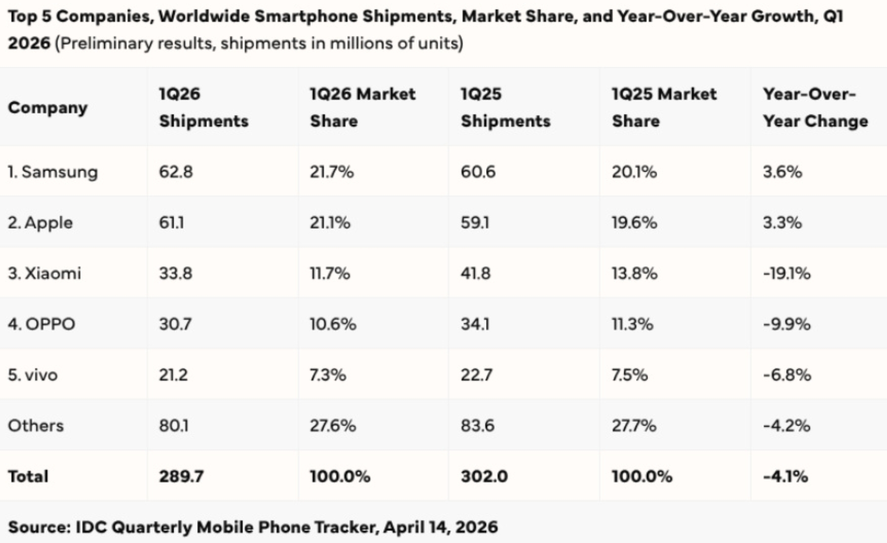 Il mercato smartphone 2026 è partito con il freno tirato. Nel primo trimestre, le spedizioni globali sono scese del 4,1% su base annua e si sono fermate a 289,7 milioni di unità. Il calo chiude una lunga serie positiva iniziata nel 2023.
