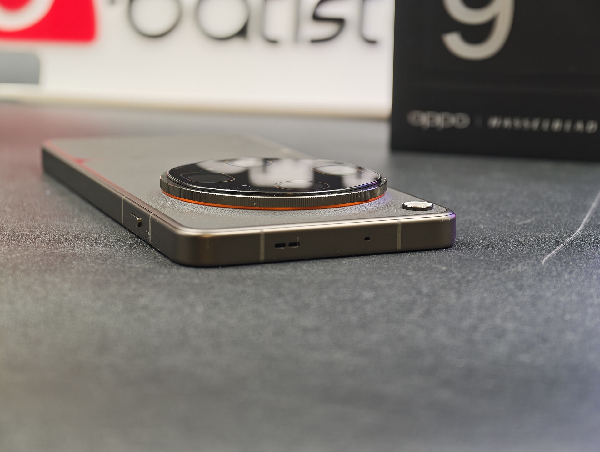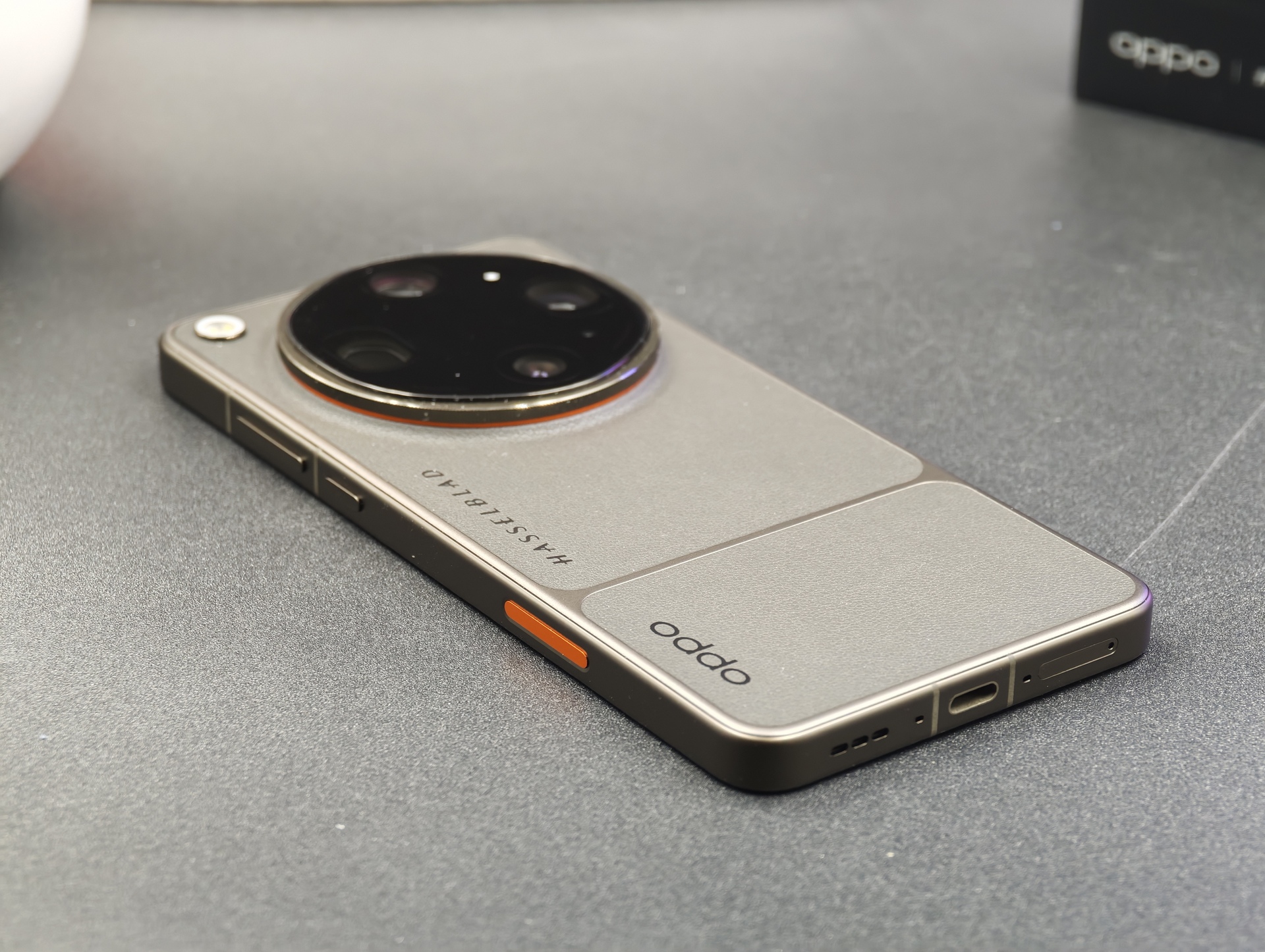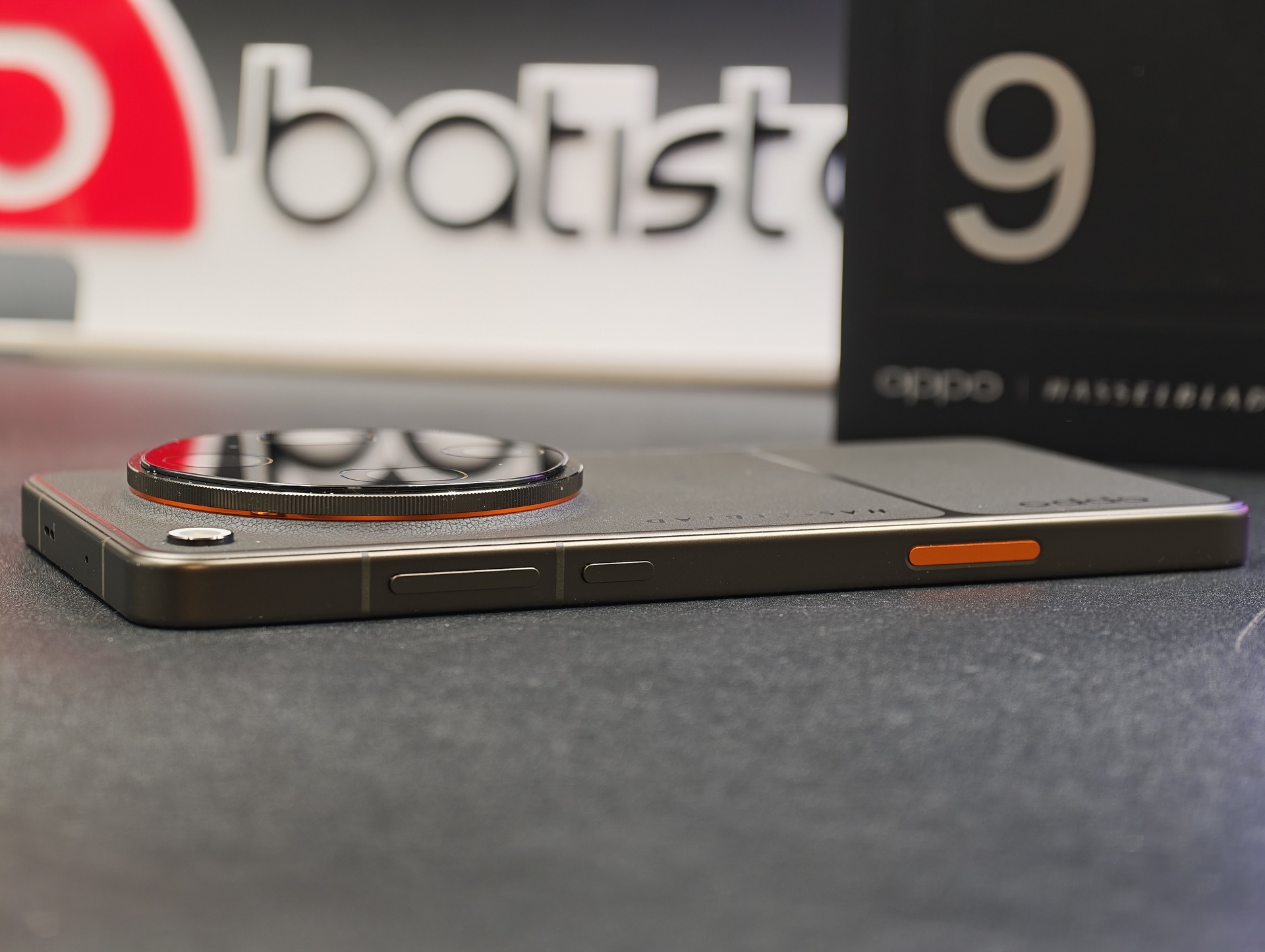 Il modulo fotocamera è enorme e volutamente protagonista. Oppo lo ha costruito come elemento centrale del design, con un’impostazione che richiama chiaramente una fotocamera dedicata. La struttura circolare è importante, scenica, e non cerca di sparire. Anzi, diventa il segno distintivo del telefono. A rafforzare tutto c’è anche una base rifinita con un grande anello arancione, una scelta estetica molto forte che riprende in modo diretto l’identità Hasselblad e lega visivamente il comparto fotografico a uno degli altri dettagli più riconoscibili del dispositivo.