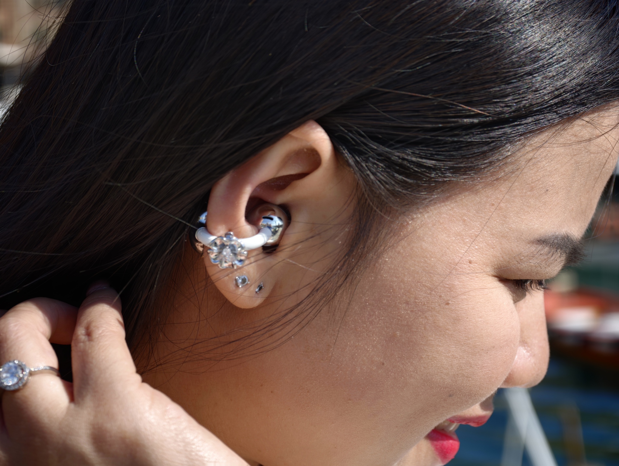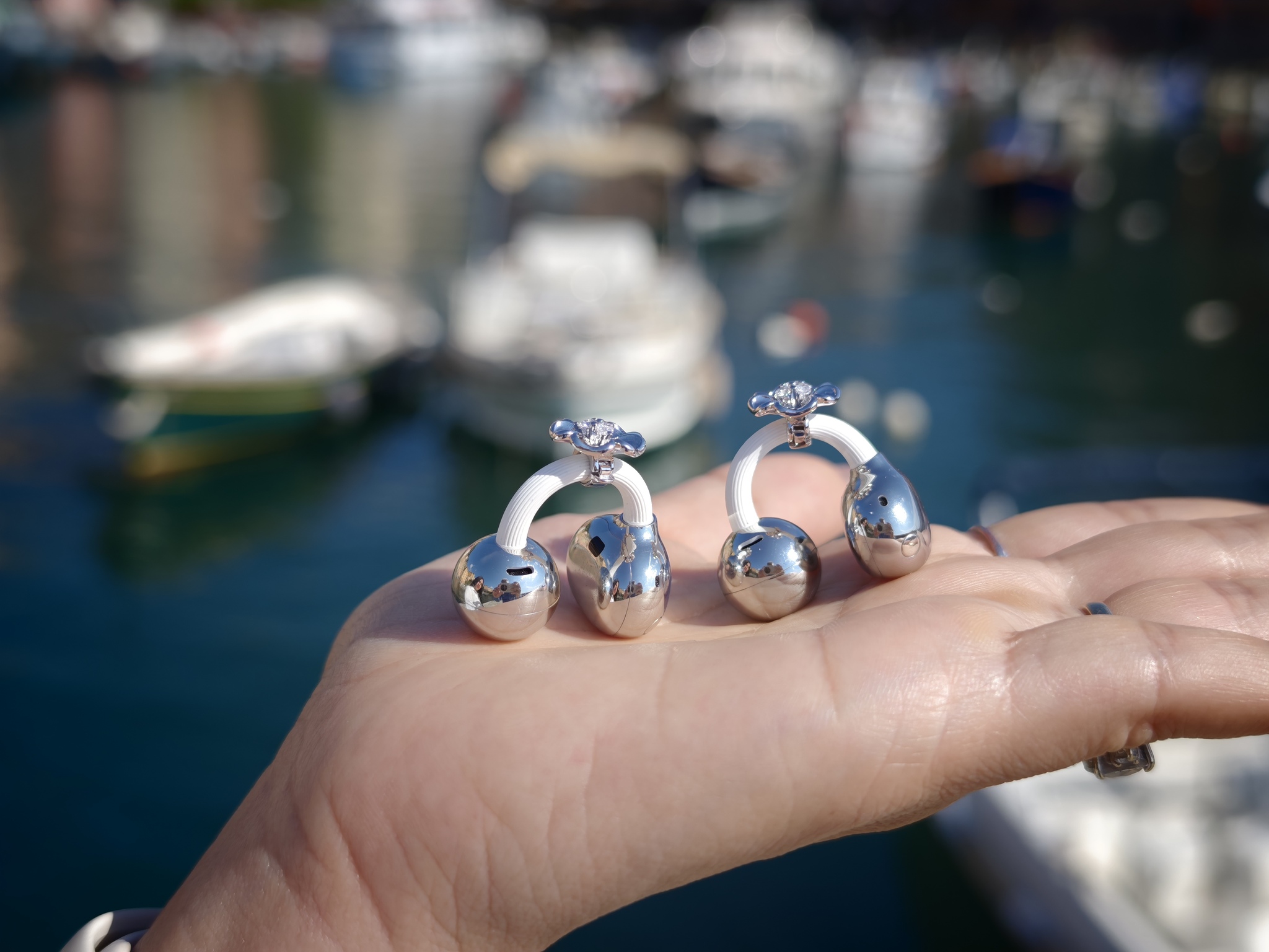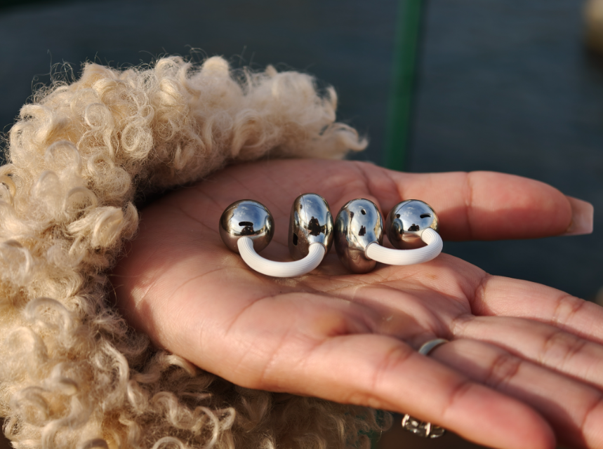 Questa è probabilmente la parte più interessante del loro racconto. In un mercato dove tanti auricolari cercano di sparire o di mimetizzarsi, qui accade il contrario. La presenza si vede, ma resta misurata. L’effetto richiama quello di un piccolo gioiello contemporaneo, leggero, meno legato all’idea classica di elettronica di consumo e più vicino a un dettaglio scelto con attenzione.
