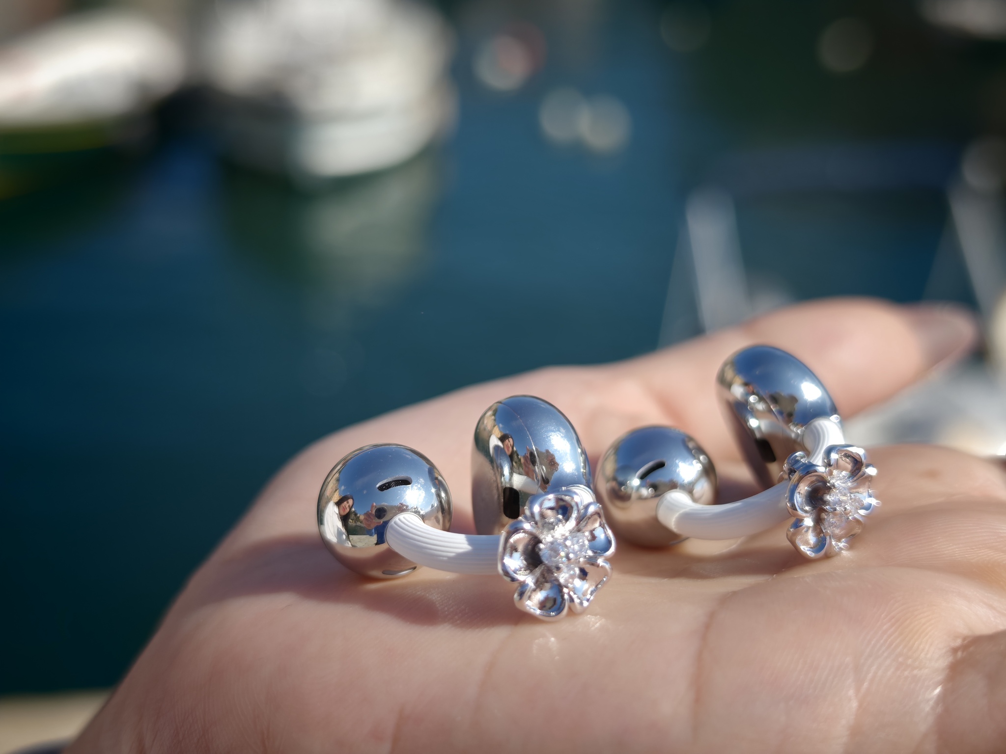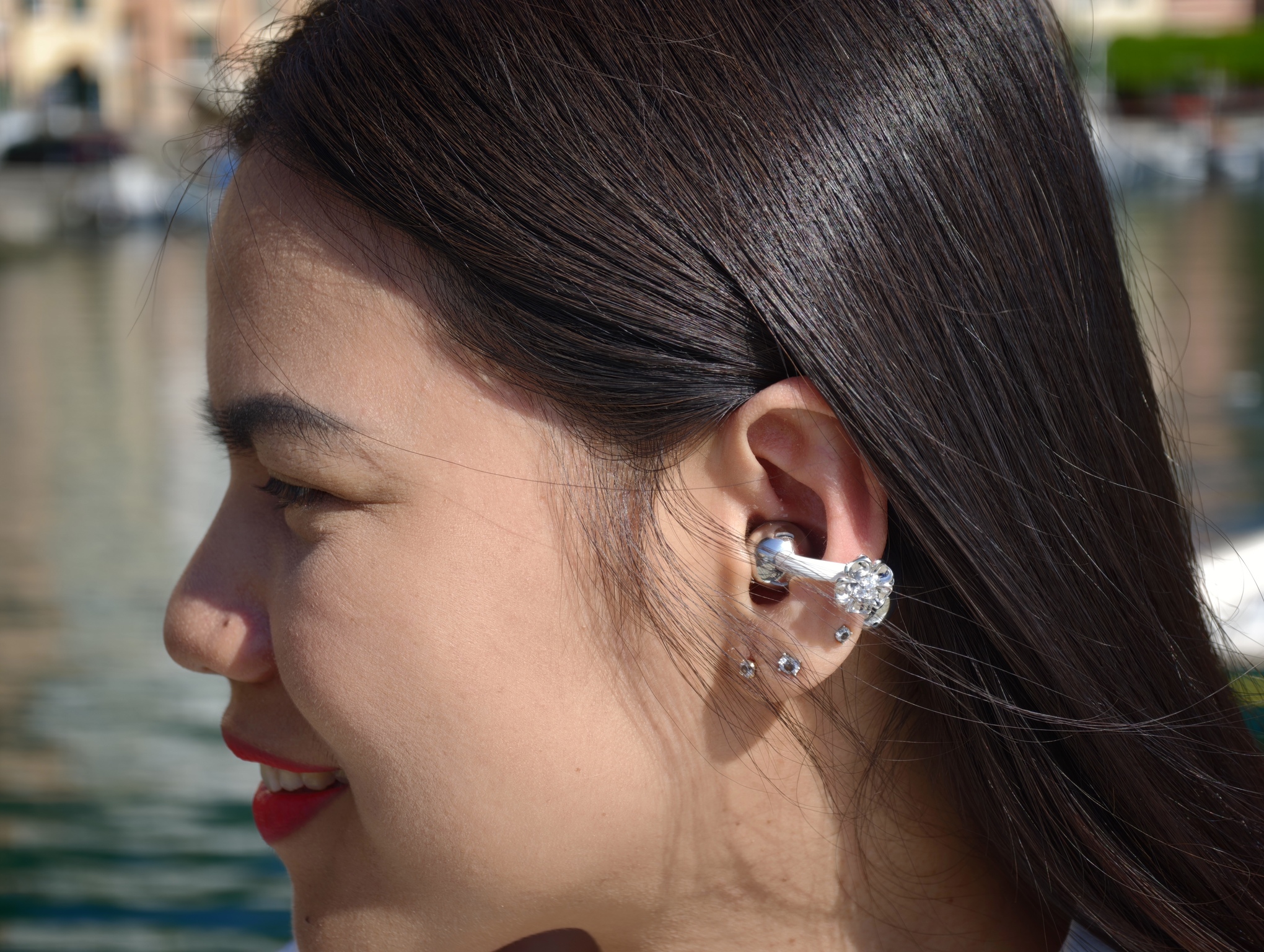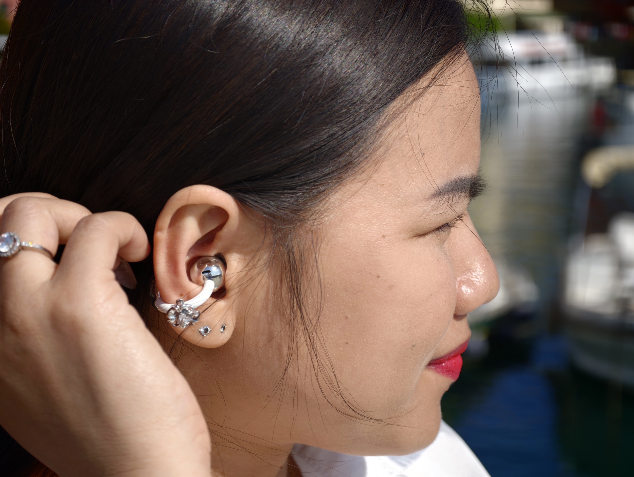 Questa è probabilmente la parte più interessante del loro racconto. In un mercato dove tanti auricolari cercano di sparire o di mimetizzarsi, qui accade il contrario. La presenza si vede, ma resta misurata. L’effetto richiama quello di un piccolo gioiello contemporaneo, leggero, meno legato all’idea classica di elettronica di consumo e più vicino a un dettaglio scelto con attenzione.