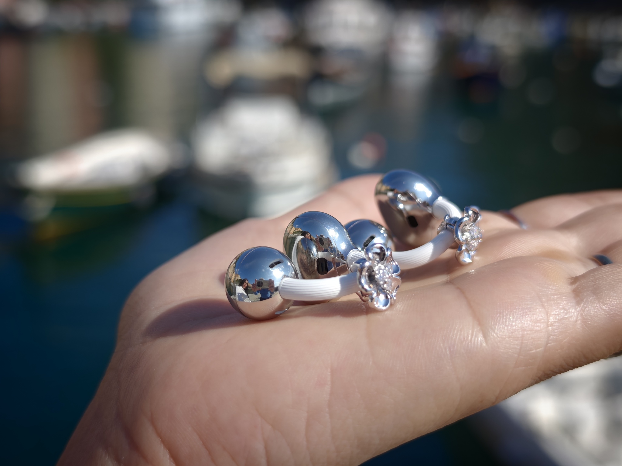 È poi dal vivo che Charm Fiore Primaverile fanno il passaggio più interessante. In foto funzionano bene, ma indossate riescono a restituire meglio quel tipo di eleganza leggera che sulla carta si intuisce soltanto. Il charm aggiunge movimento, cattura la luce in modo delicato e rende le Huawei FreeClip 2 ancora più riconoscibili, senza far perdere loro quella pulizia visiva che resta uno dei punti migliori del progetto.